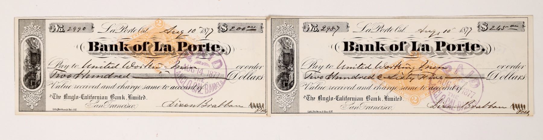 2 c. 1877 Bank of La Porte checks to United Working Union. Rare evidence of labor union donations at the time. California La Porte