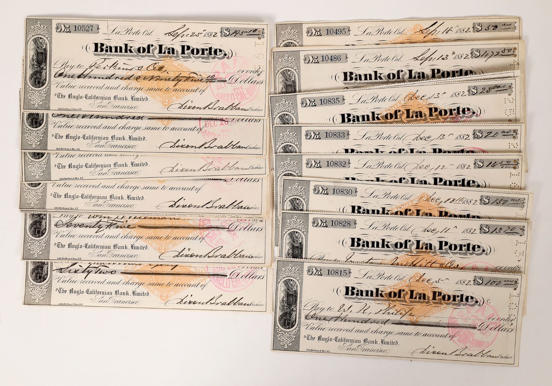About 30 c. 1882 Bank of La Porte checks with RNG and nice mining vignette on left. California La Porte c1882