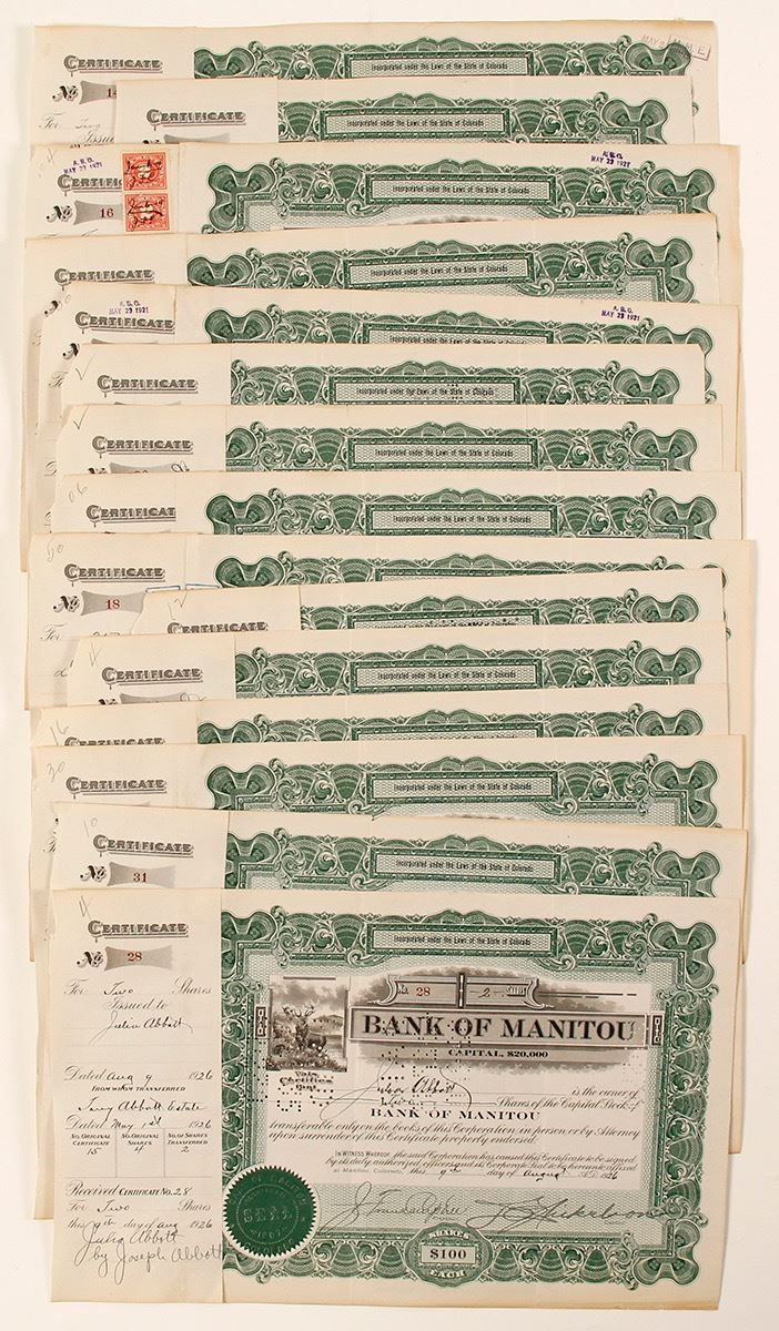 14 green issued stocks Date: 1914-1926 Location: Manitou, Colorado HWAC# 65013