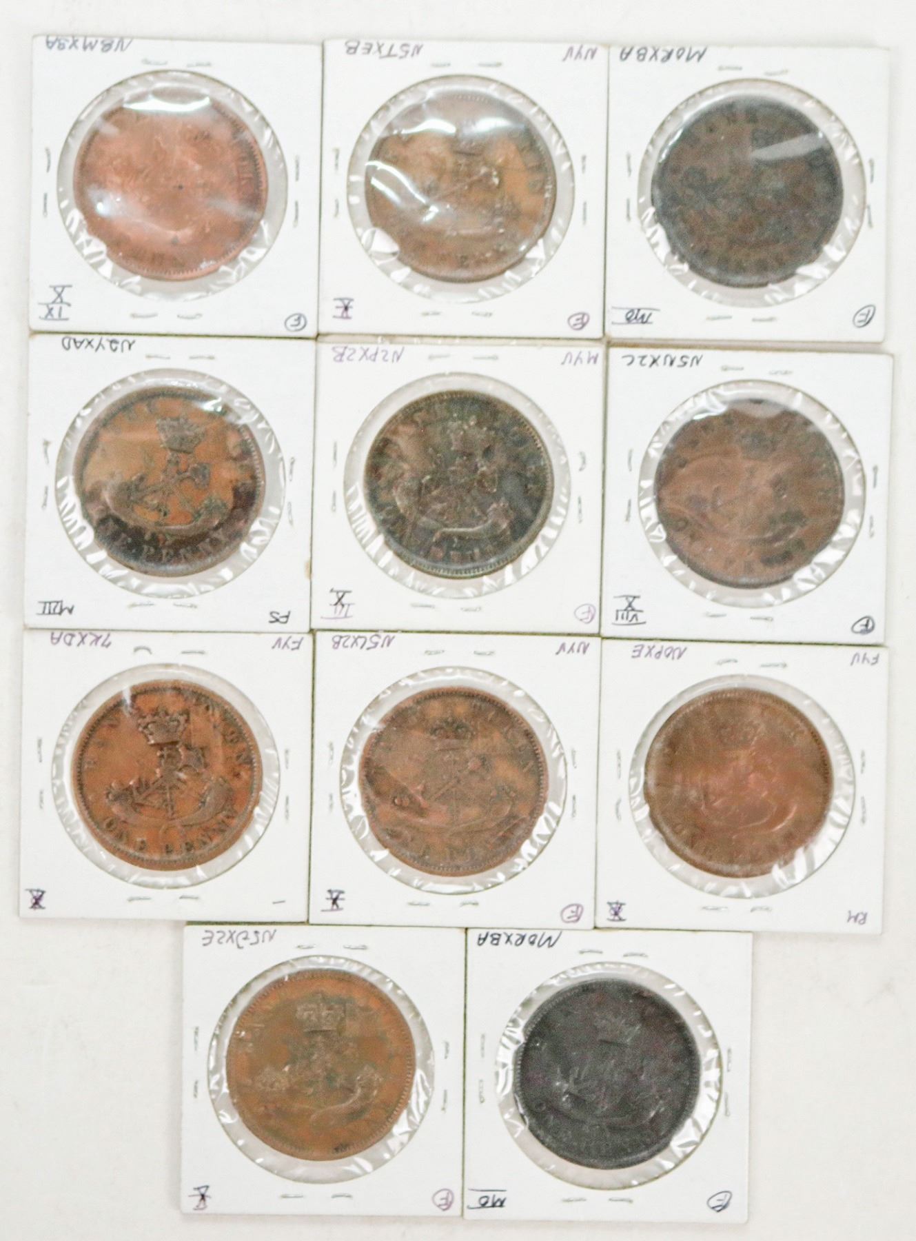Eleven copper coins from 1852-1857: Province of Canada, Bank of Upper Canada. F-AU condition.
