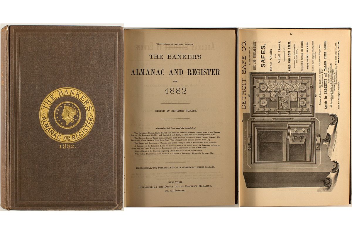1882, published by Bankers Magazine. 328pp plus 38pp of advertisements. Brown boards, gilt lettering, weak on spine. Gilt "double eagle" $20 in the center of the logo on the front cover, very attractive. 6 x 9.5". Lists all of the banks by city and state, with officers, capital. Alpha lists of cashiers, list of Savings banks. Choice early (and rare) bank reference.City: County: State: Date: 1882