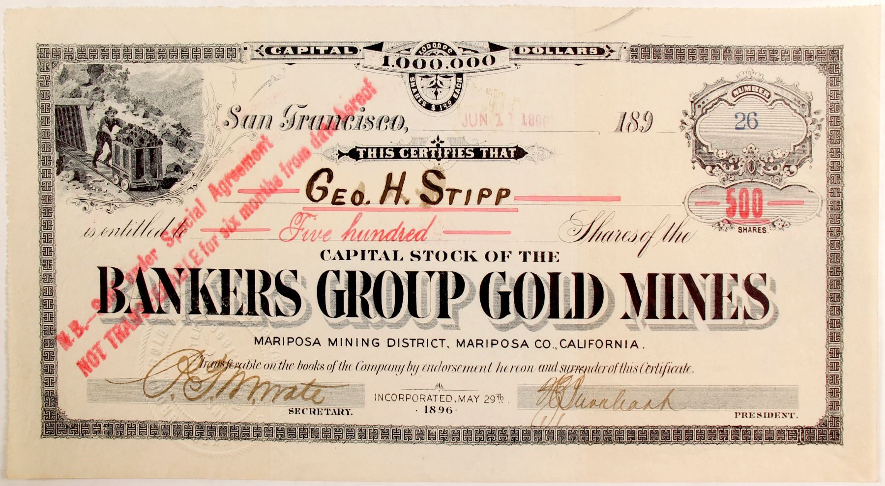 Five hundred shares of capital stock of the Bankers Group Gold Mines - Mariposa Mining District, Mariposa County, CA, number 26 issued to Geo. H. Stipp, on June 11, 1899. Vignette of miner with load of gold. Ken . Ken Prag Collection