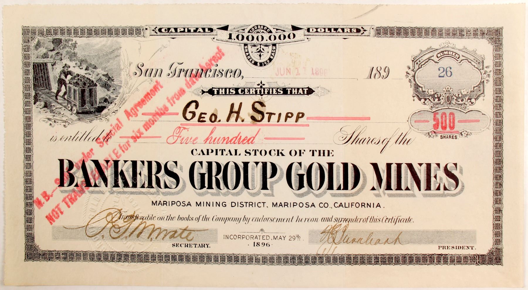 Five hundred shares of capital stock of the Bankers Group Gold Mines - Mariposa Mining District, Mariposa County, CA, number 26 issued to Geo. H. Stipp, on June 11, 1899. Vignette of miner with load of gold. Ken Prag Collection. State: City: Date: HWAC# 81850