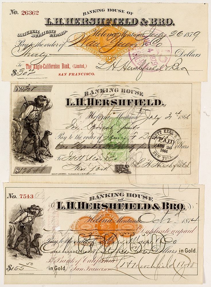 Lot of nine choice RN imprinted checks. eight different for L.H. Hershfield & Bro., Bankers in Helena. Includes four pictorial pieces: 1866 (RN-B green, dog & prospector vignette), 1874 (RN-D, dog & prospector vignette), 1876 (RN-D, in Gold, prospector vignette), and 1881 (RN-G First of Exchange, allegorical vignette). Five other RN checks: 1876 & 1878 (RN-D), 1879 (RN-G, Sun River dateline), 1879 (Original Duplicate, RN-G), and 1877 (Original, RN-G). Nice variety and representation of pieces from this important Montana bank. City: Helena State: Montana Date: 1866-1881 ID: 36243