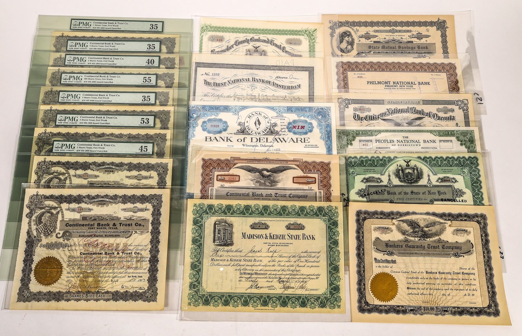 Lot of 19. Included: Continental Bank & Trust Co., Fort Worth, Texas (8 stocks issued 1903-05, 7 are in PMG holders and graded plus 1 uniss. of different variety); Madison & Kedzie State Bank (1920); Bank of Delaware (1968); Land Bank of the State of New York (1923); Peoples National Bank of Norristown, PA (unissued); Citizens National Bank of Oneonta (unissued); First National Bank of Amsterdam (1937); Rensselaer County Bank & Trust Co. (1932); Philmont National Bank (unissued); State Mutual Savings Bank (uniss.); Bankers Guaranty Trust Co. (uniss.).