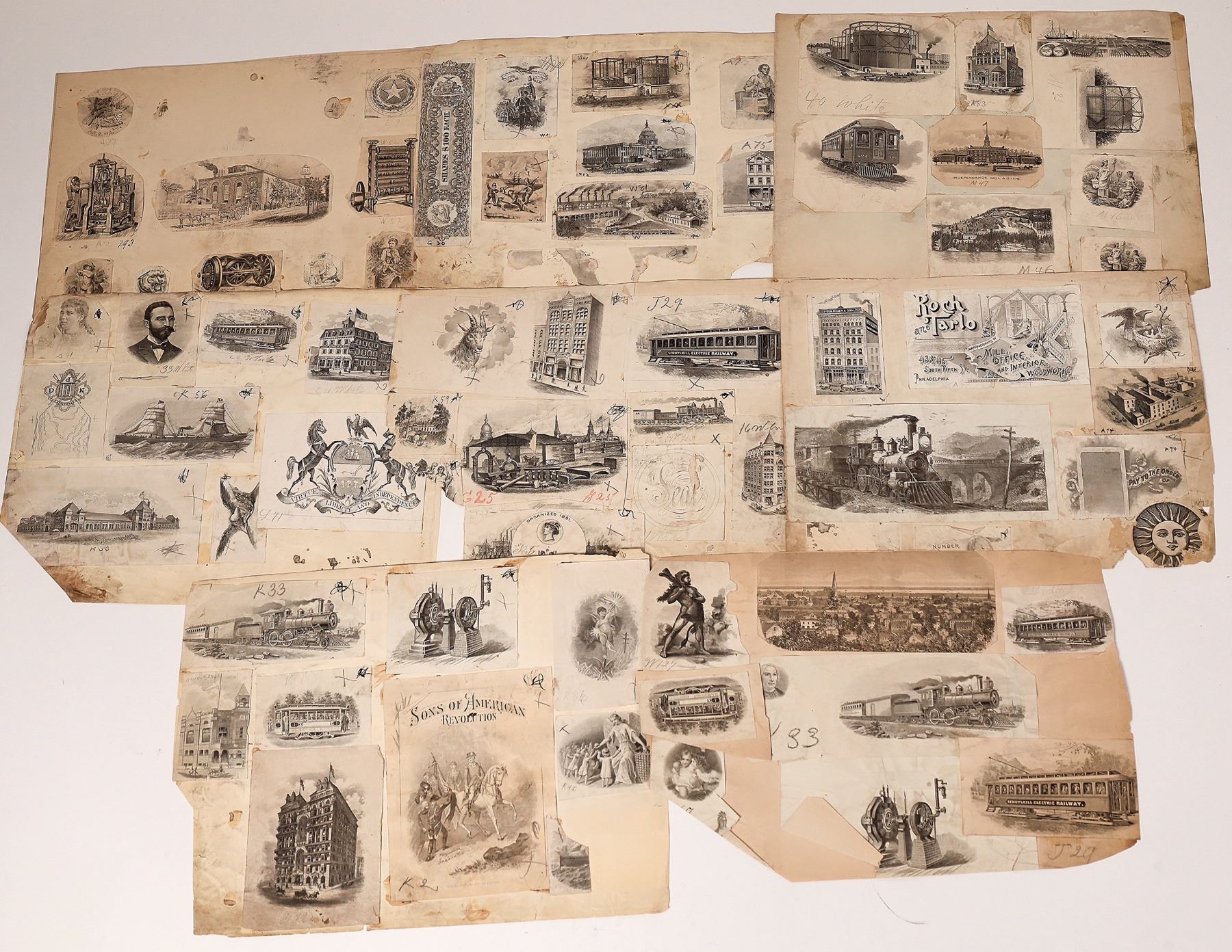 About 75 proof vignettes, many with railroad themes. Locomotives, terminals and more. Philadelphia Pennsylvania