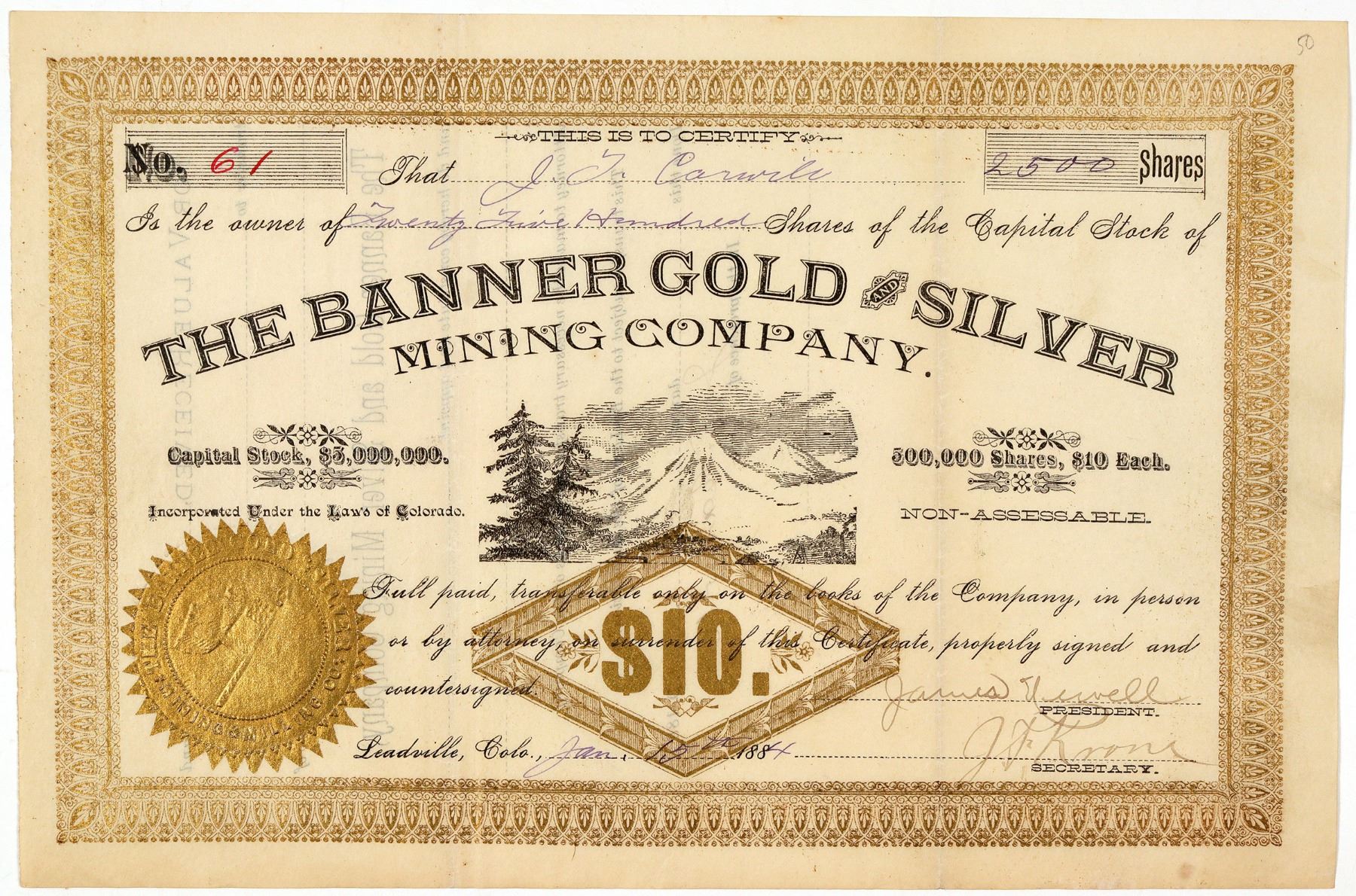 Dateline Leadville, Colo., Jan. 15th, 1884. No. 61, issued for 2,500 shares to J.T. Carville. Signed by president James (illegible) and secretary J.T. Kroni (?). Not cancelled. Attractive design with gilt border, gold seal, RN facsimile, and mountain vignette. No printer. 6.75 x 10.25" Folds, clean. Not in Filer. The Banner Mine can be found in the Leadville District on the Mt. Sherman USGS Quadrangle. Production information was not available in our extensive Colorado references. () Ken Prag Collection