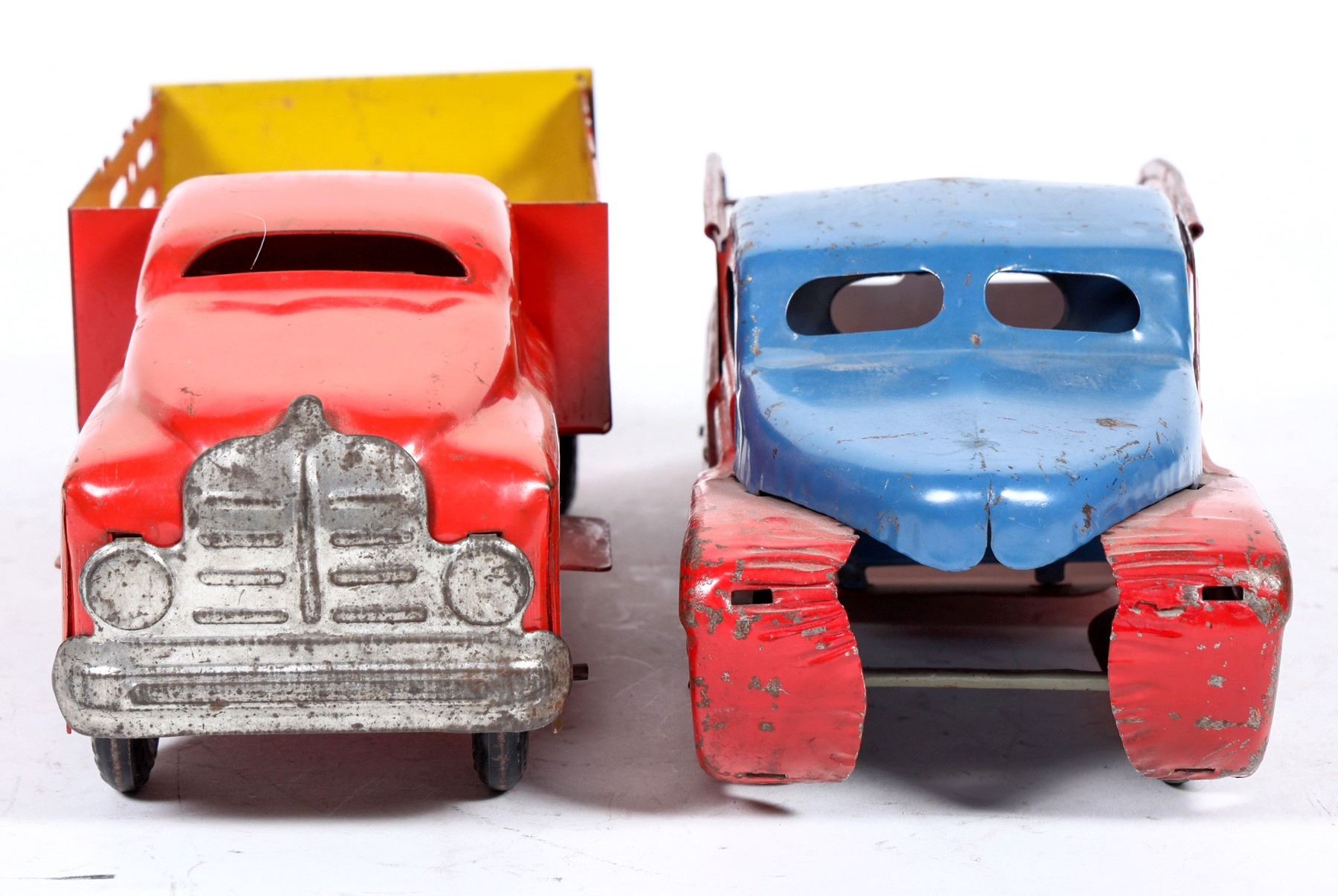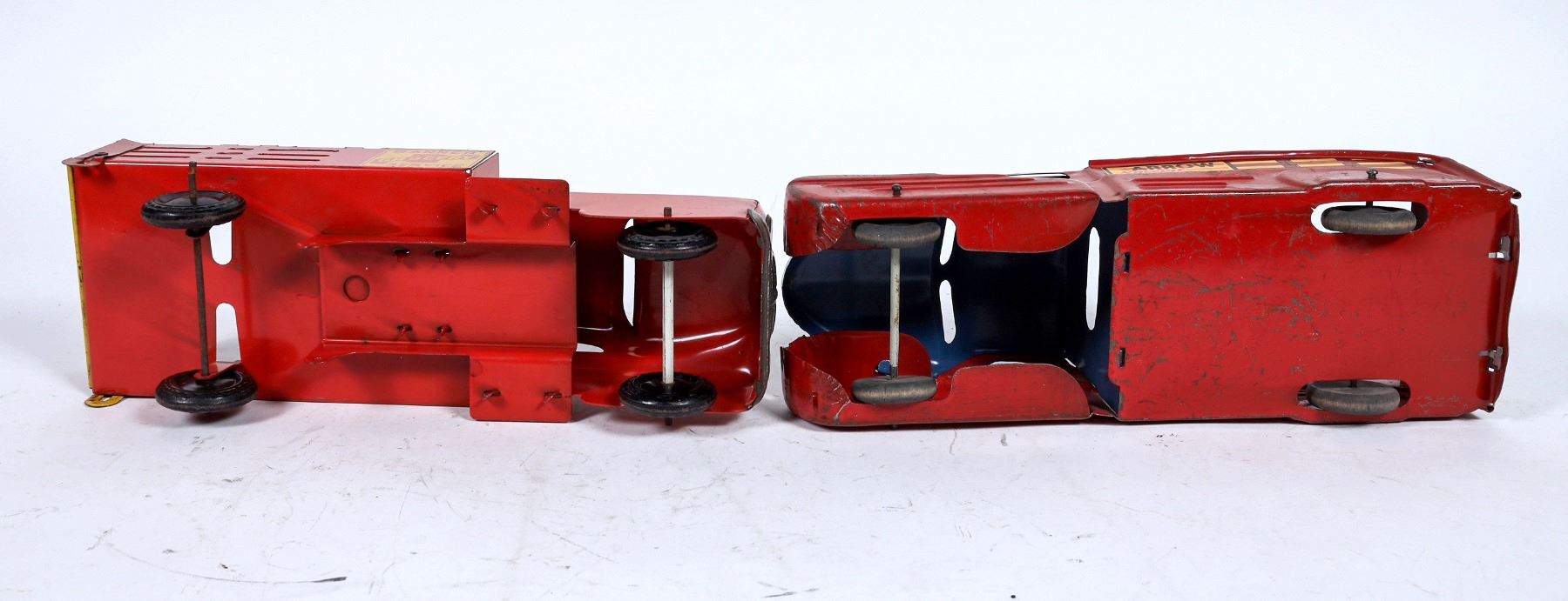 Lot of 2. Pressed Steel, Banner Grocery Service. Excellent Condition. Clear graphics. Red/Blue. Operable. Arrow Special delivery, Structo. Play wear, good graphics , missing grill. each 13 1/2”L
