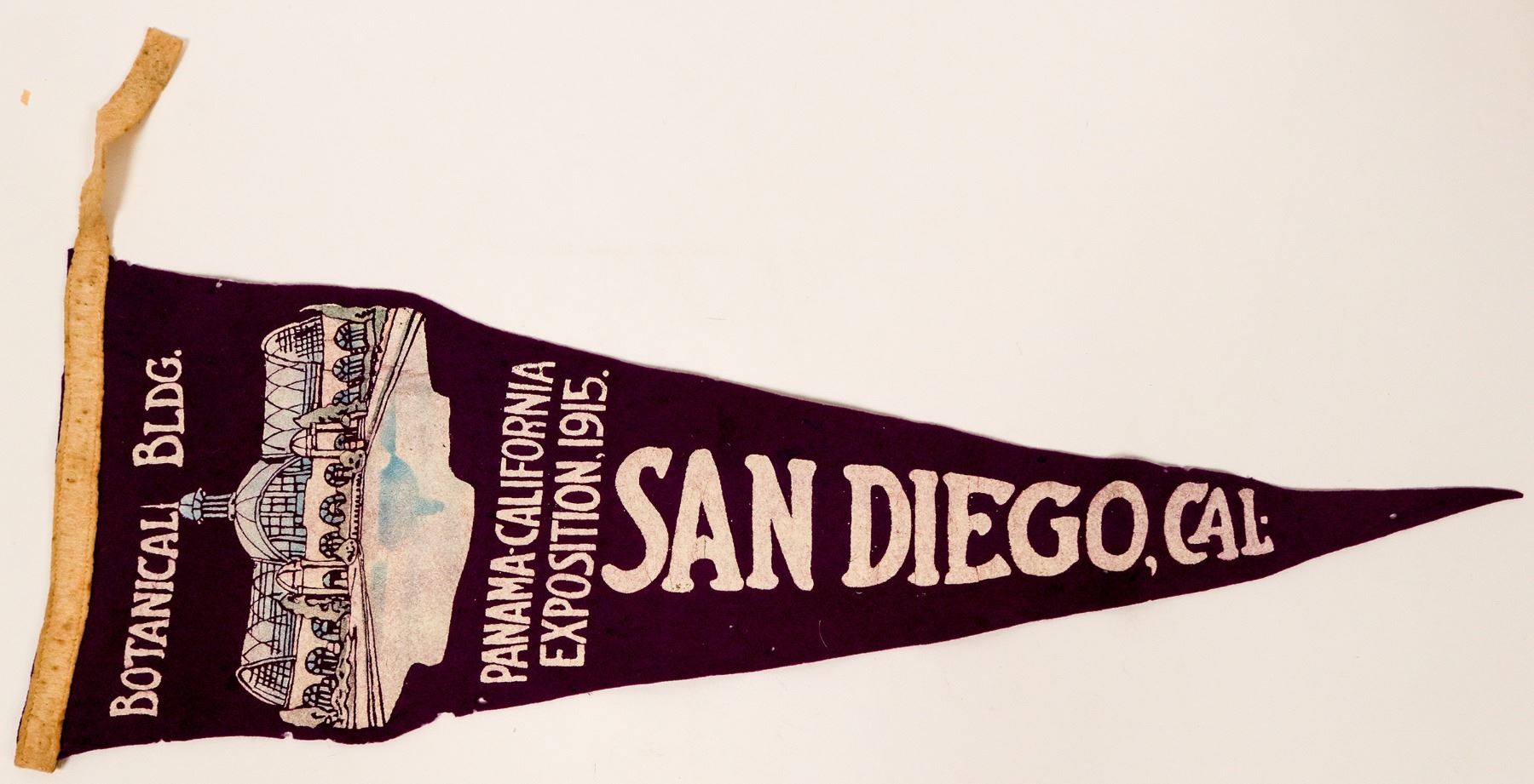 Two-foot long purple felt banner highlights the Panama-California Exposition, in San Diego, c1915. Banner features a graphic of the Botanicali Building.