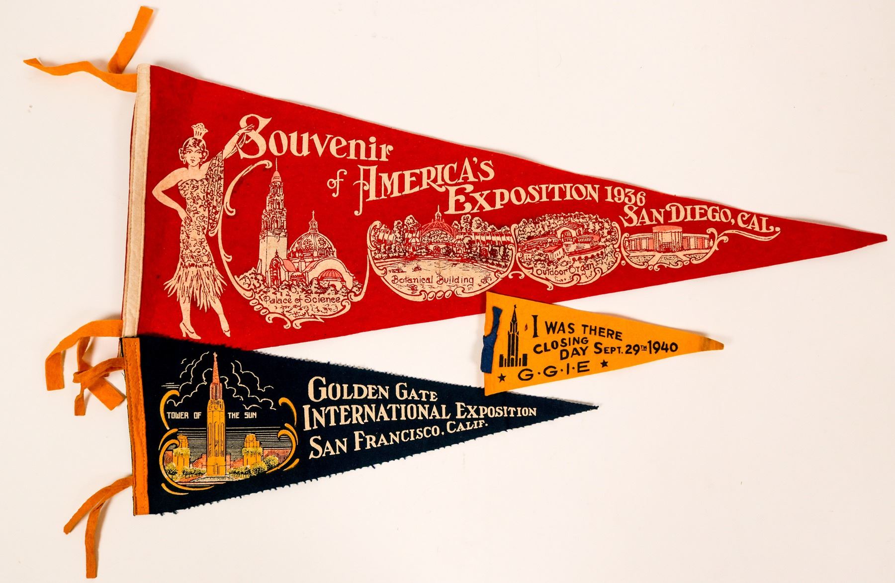 Two banners from the Golden Gate International Exposition (GGIE), held at San Francisco's Treasure Island, are dated closing day, 1940 and undated. The exposition, which ran from 1939-40, was a World's Fair celebrating, among other things, the city's two newly built bridges, the San Francisco–Oakland Bay Bridge and the Golden Gate Bridge. Third and largest banner is from America's Exposition, dated 1936, part of the California-Pacific International Exposition, held in San Diego in 1935-36.