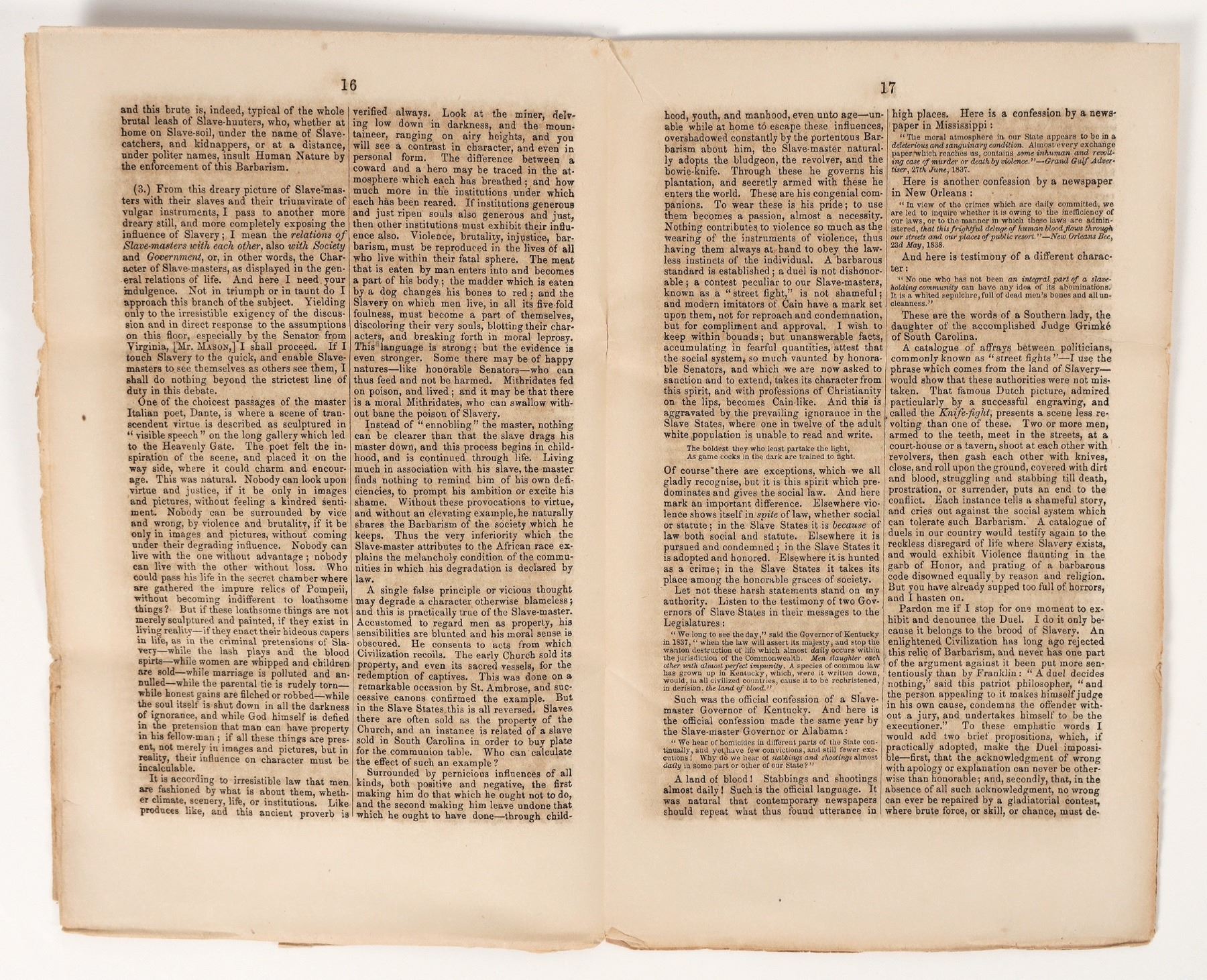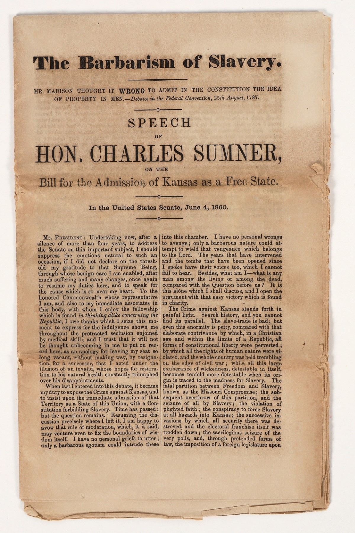 Charles Sumner speech, "The Barbarism of Slavery", choice selection! "Sumner's incendiary rhetoric solidified his reputation as a leading Radical Republican. The speech further inflamed tensions between the North and South and contributed to the escalating national crisis that would erupt into the Civil War just months later." (https://tinyurl.com/3kdrp664). This 32 page pamphlet dates to c1860, just before the Civil War, and unfolds like a newspaper. Unfolded, it measures 23.75x39", with each page measuring about 6x9.25". Small ruptures along the creases are present, rough edges, please inspect photo.