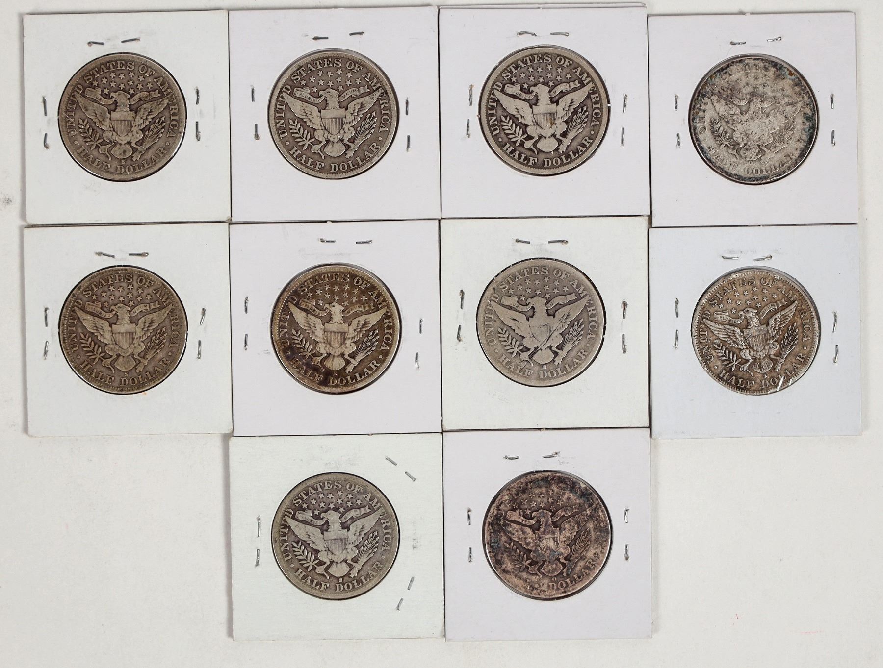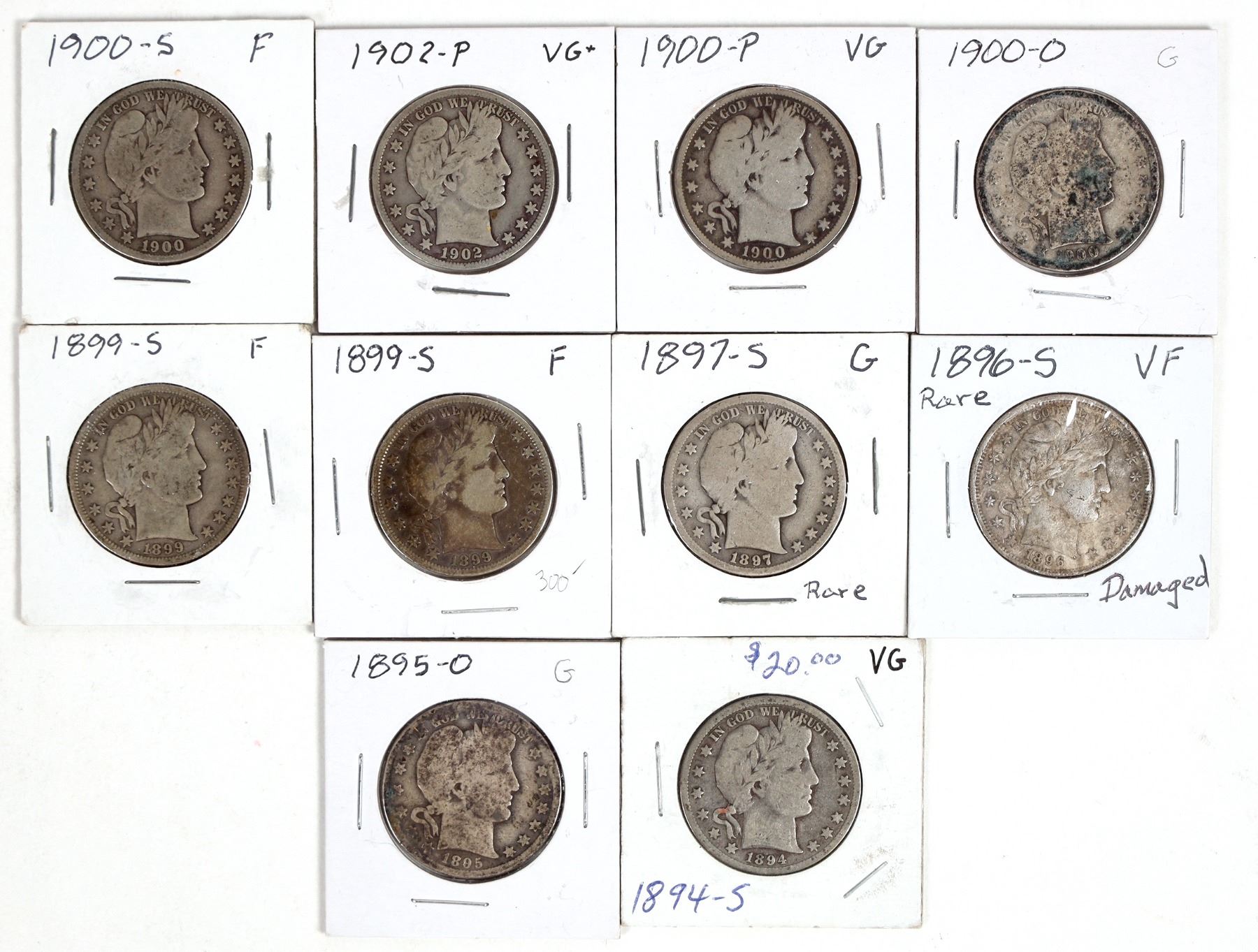 Ten early Barber half dollars: 1894-S (VG); 1895-O (AG-G); 1896-S (VF details, damaged); 1897-S (G); 1899-S (F); 1899-S (VG-F); 1900-O (G); 1900 (VG); 1900-S (F); 1902 (VG).