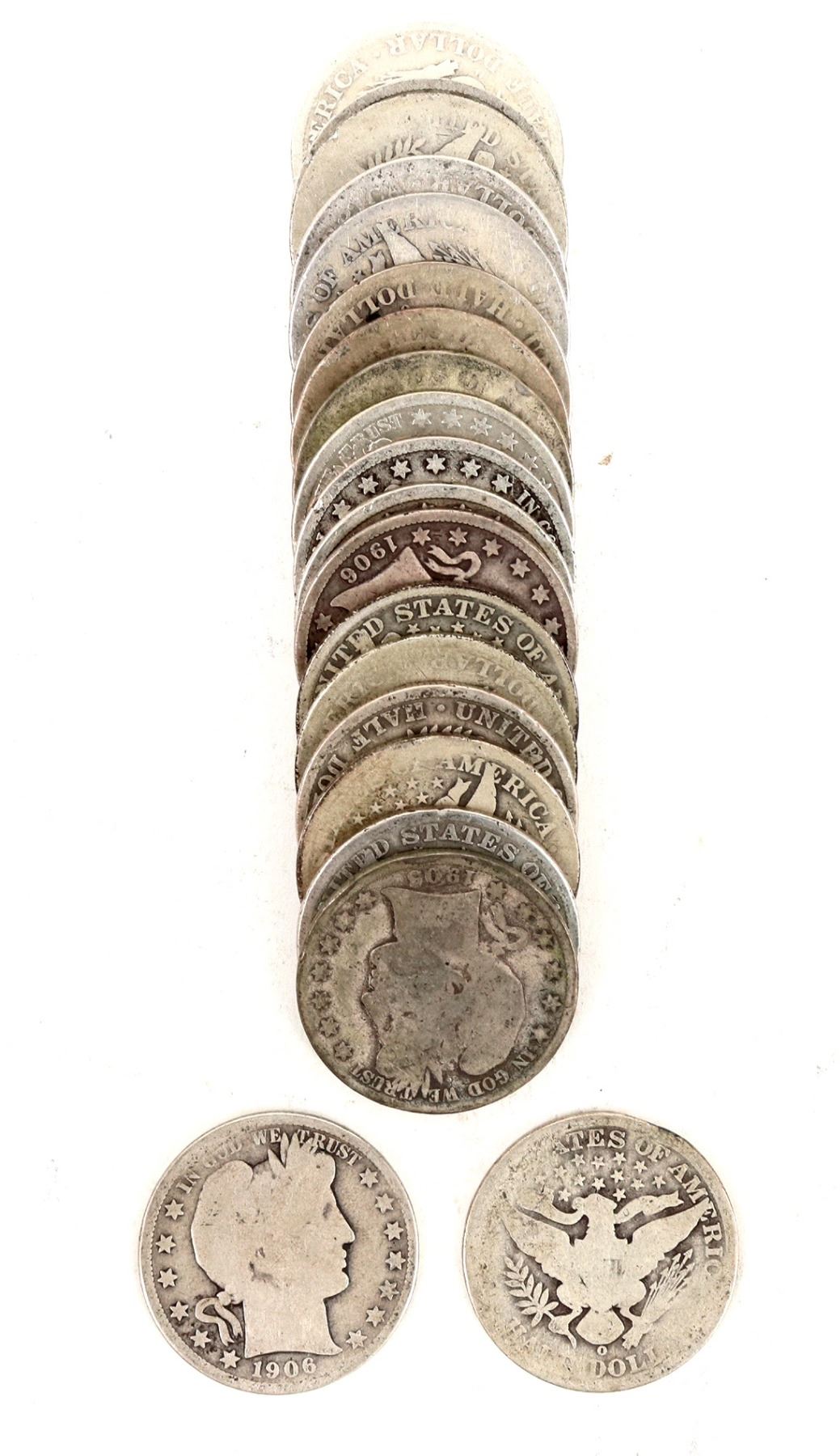 Twenty Barber half dollars, AG-G condition. 1905; 1906 (4); 1906-D (3); 1906-O (3); 1908-O (6); 1908-D; 1908-S (2).
