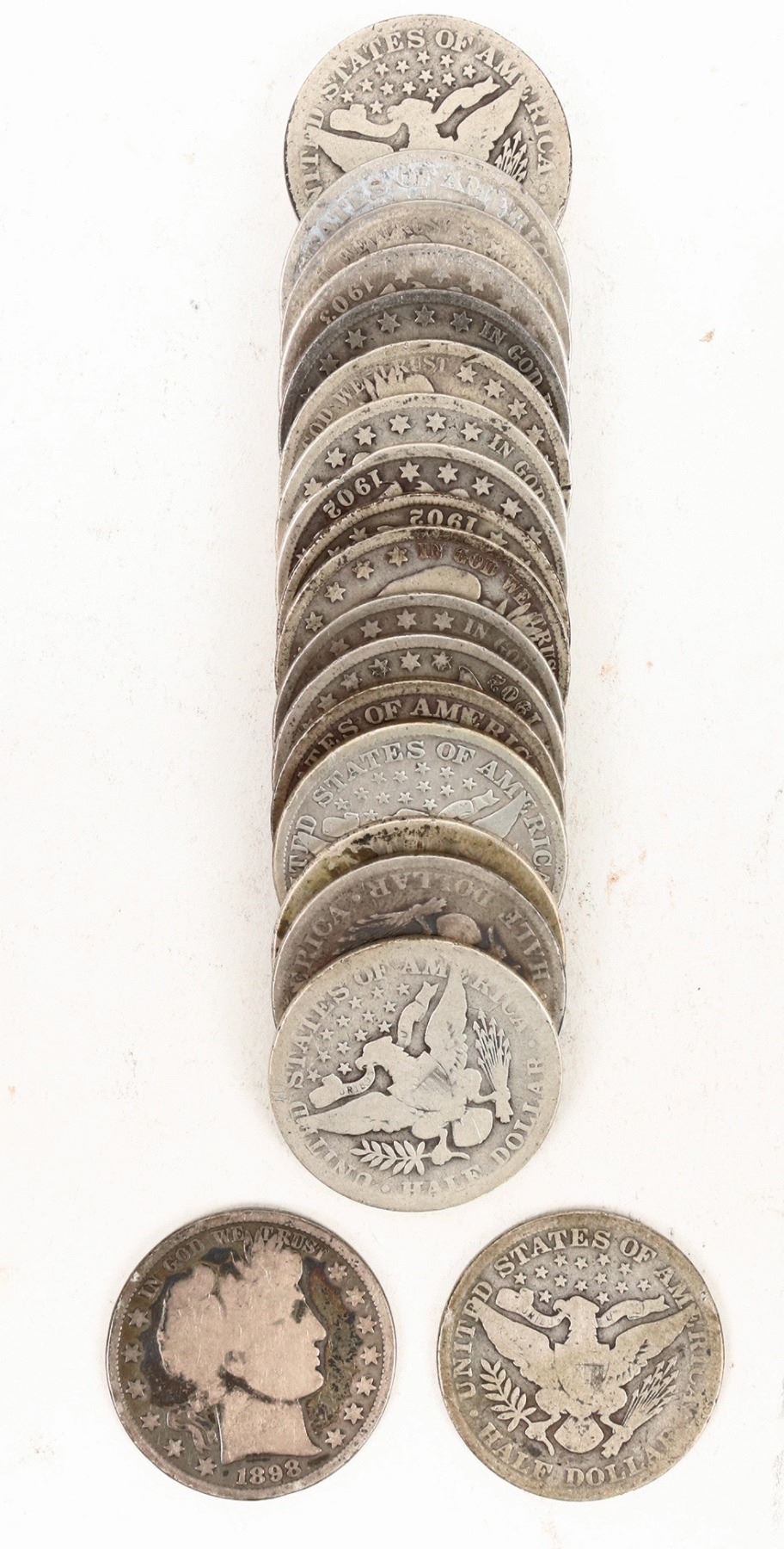 Group of 21 Barber half dollars. 1898; 1899 (3); 1900 (3); 1902 (8); 1903-O (2); 1904 (4). AG-G+ condition.