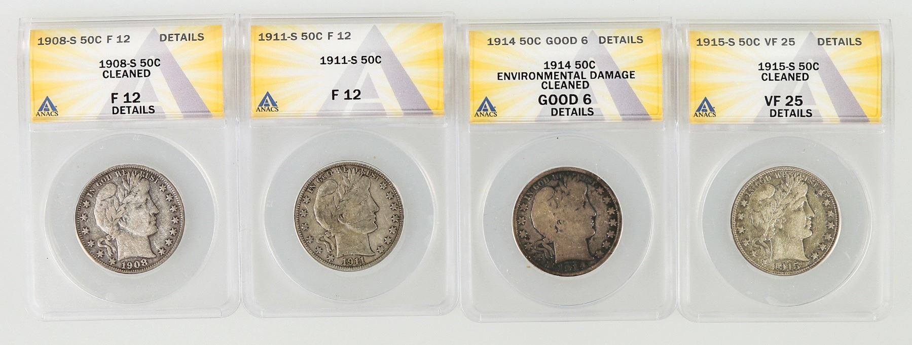 Four ANACS graded Barber half dollars: 1) 1908-S F 12, Details, cleaned. 2) 1911-S, F 12. 3) 1914, Good 6 Details, environmental damage cleaned. 4) 1915-S, VF 25 Details, cleaned.