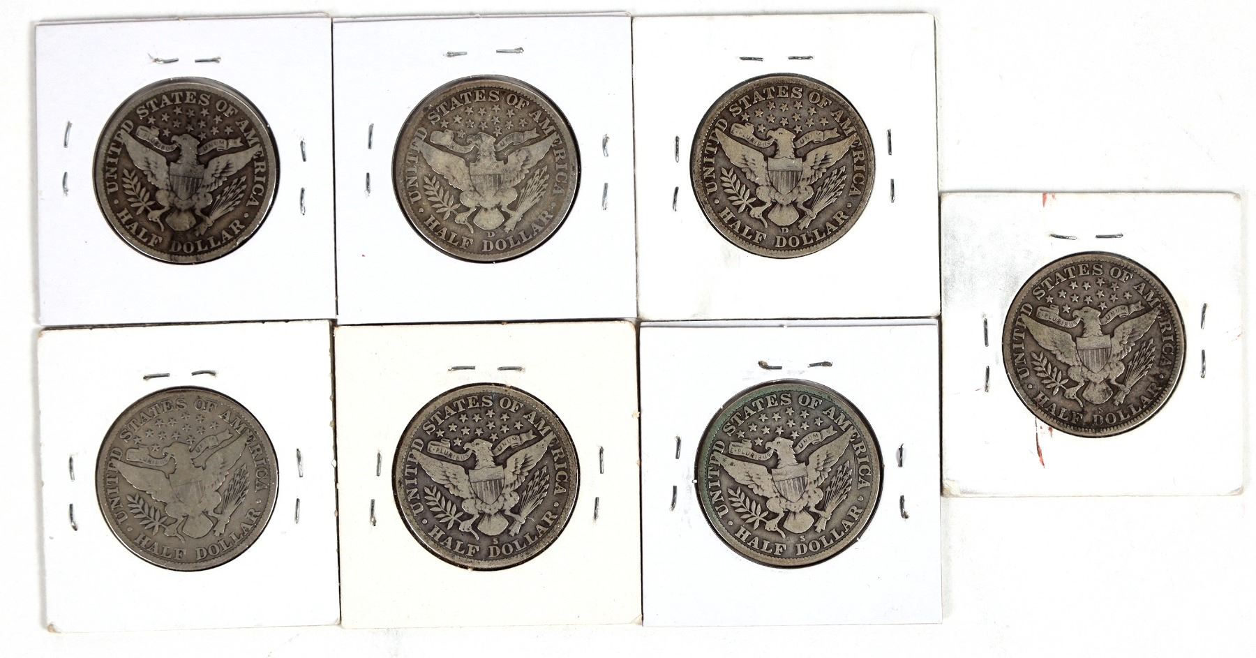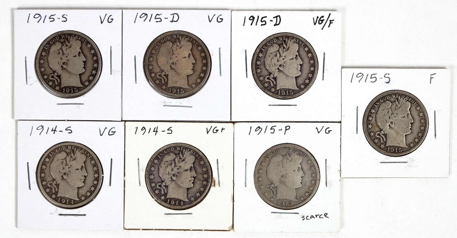 Seven Barber half dollars: 1914-S (2: VG); 1915 (VG); 1915-D (2: VG); 1915-S (2: VG, F).