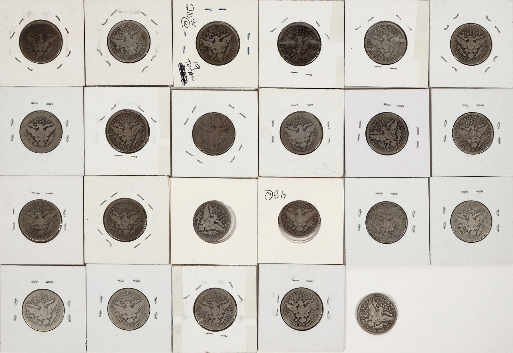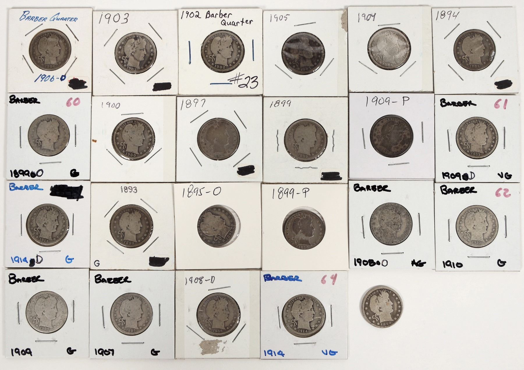 Lot of 23 Barber quarters in AG, G & VG condition. 1892; 1893; 1894; 1895-O; 1897; 1899 (2); 1899-O; 1900; 1902; 1903; 1904; 1905; 1906-O; 1907; 1908-O; 1908-D; 1909 (2); 1909-D; 1910; 1914; 1914-D.