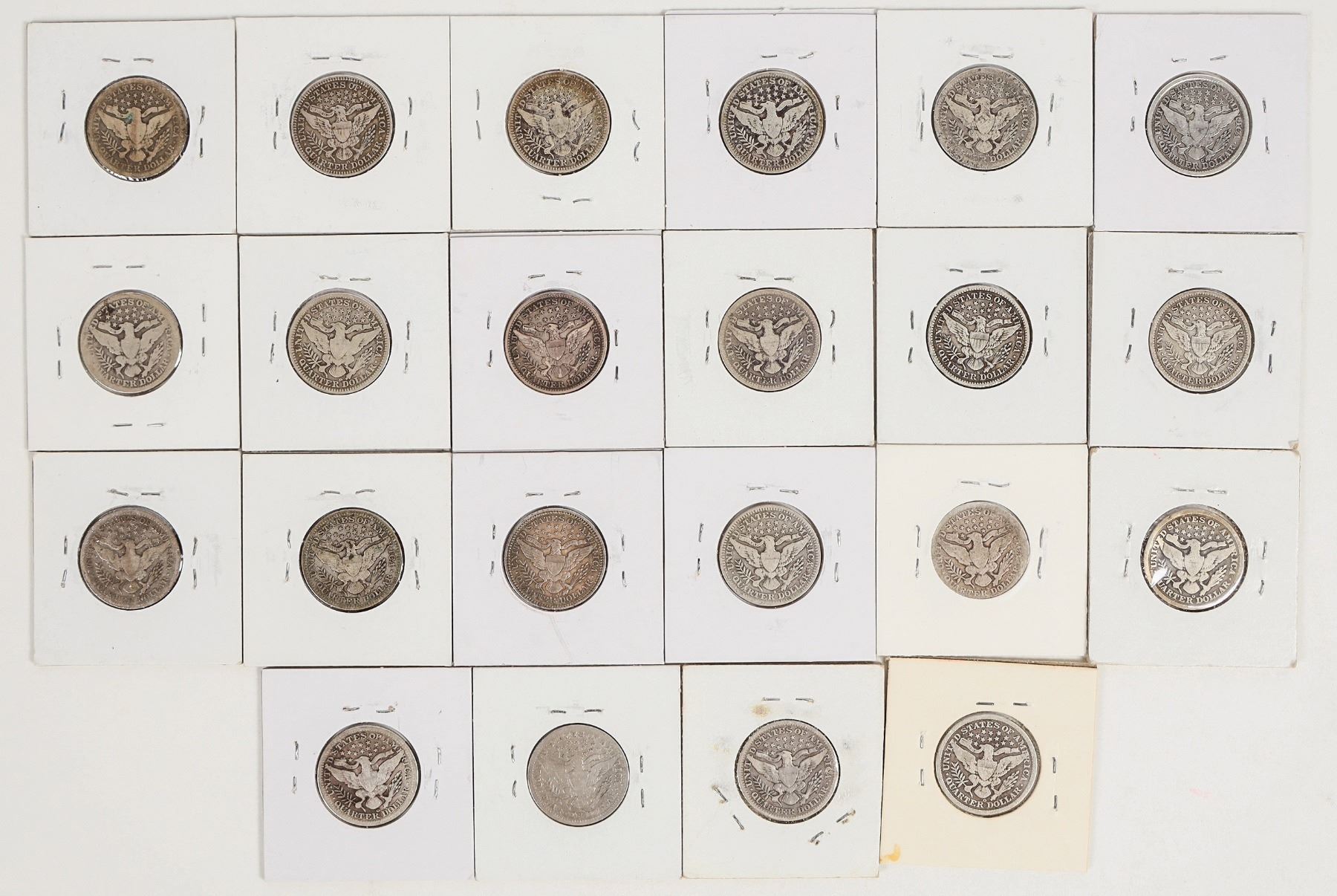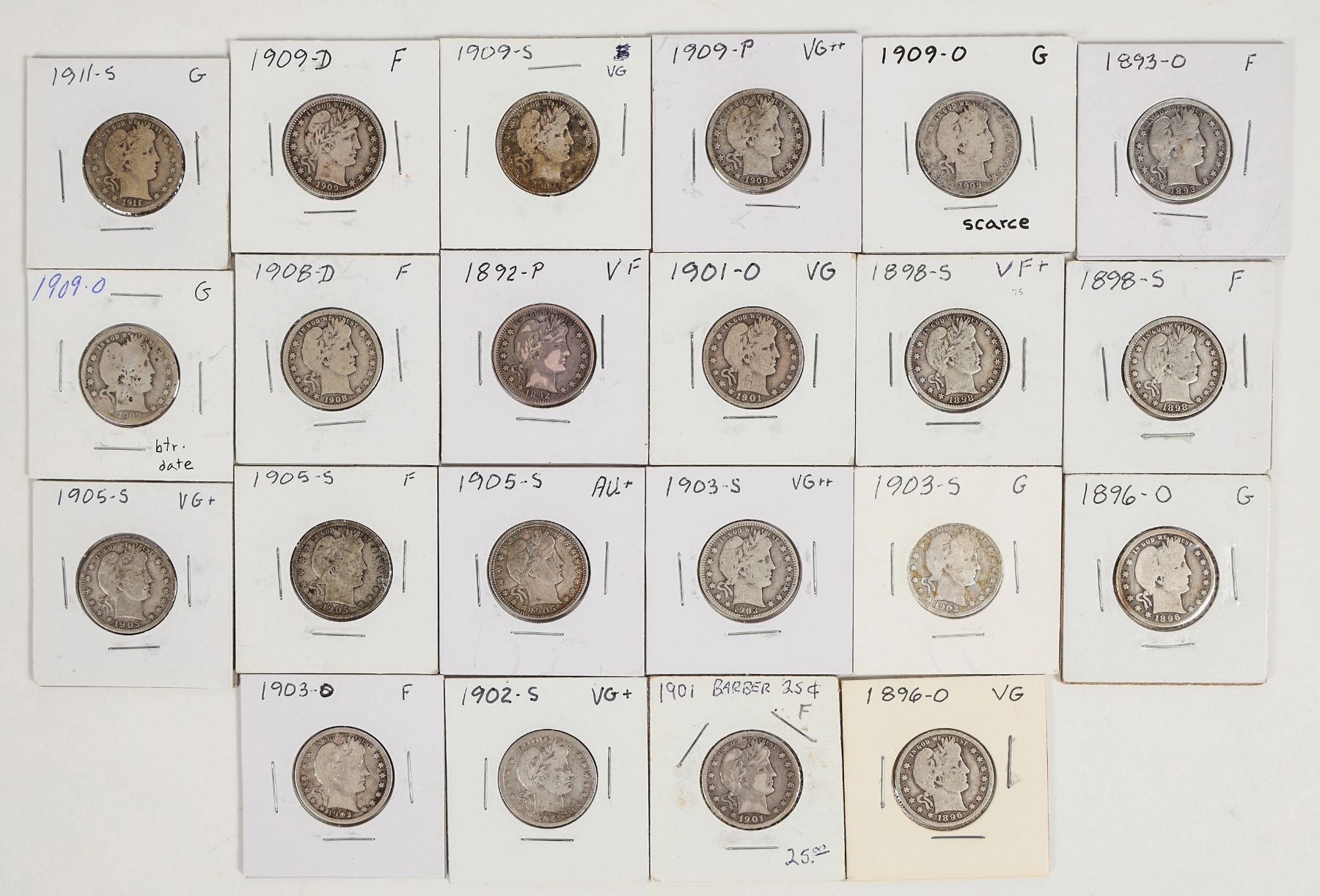 Twenty two Barber quarters: 1892 (VF); 1893-O (F); 1896-O (2: G, VG); 1898-S (2: F, VF); 1901 (F); 1901-O (VG); 1902-S (VG); 1903-O (F); 1903-S (2: G, VG); 1905-S (3: VG, F, EF-AU); 1908-D (F); 1909-O (2: G); 1909 (VG); 1909-D (F); 1909-S (VG); 1911-S (G).