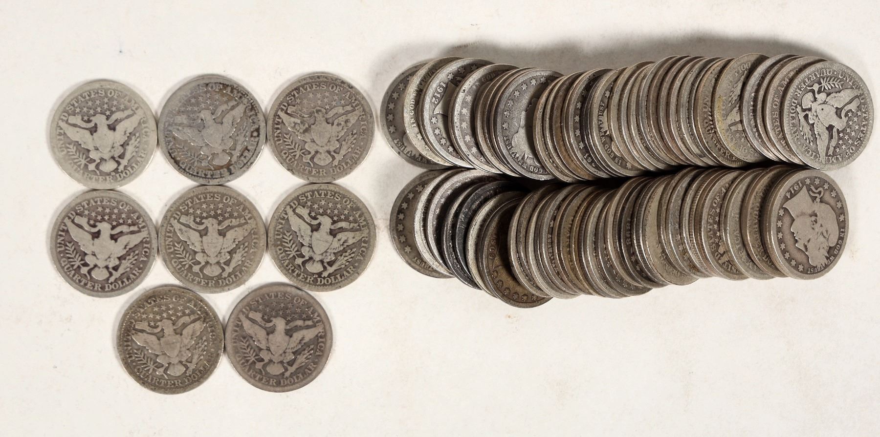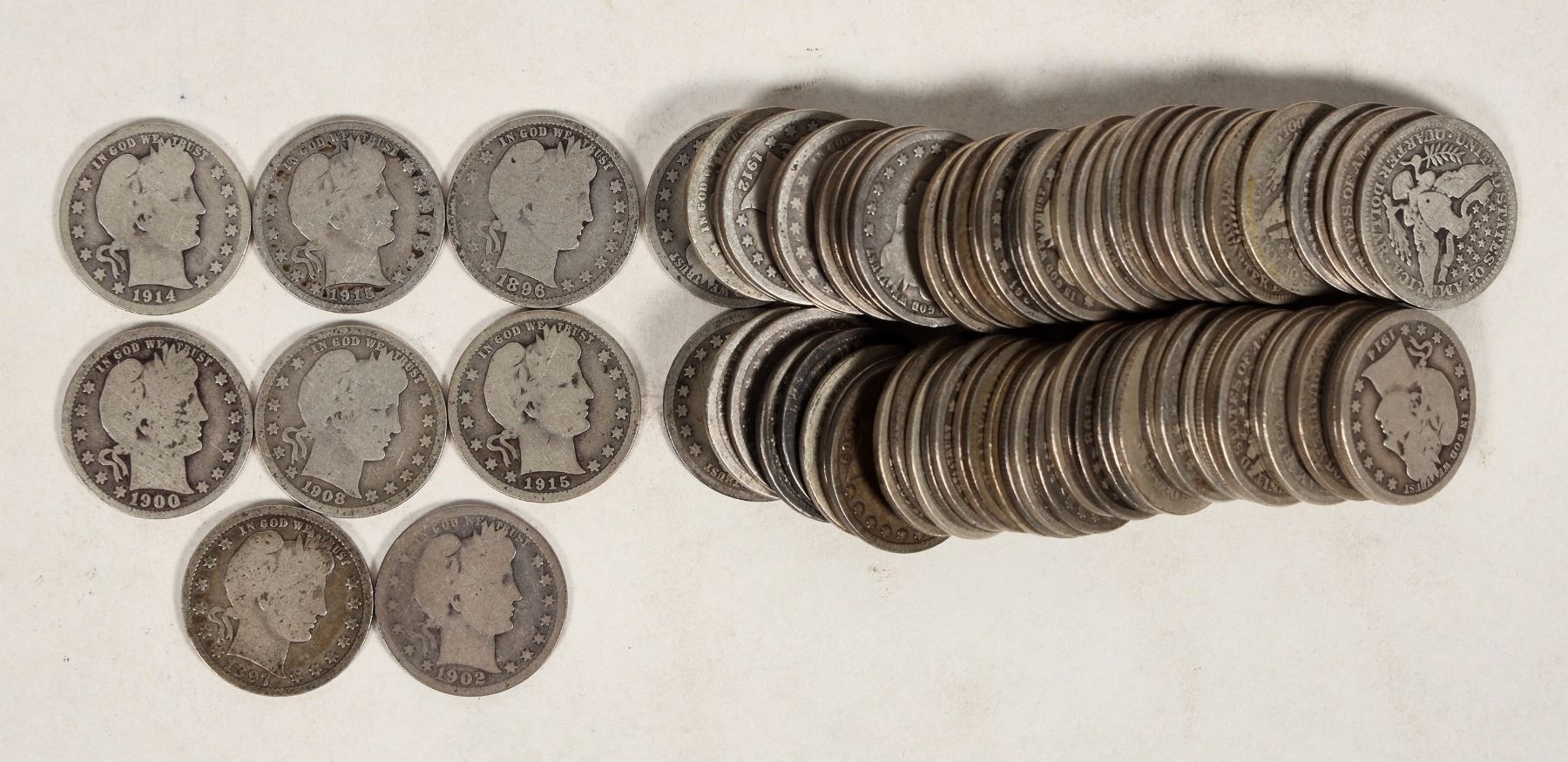 Circulated Barber quarters (80 coins). All dates readable, G-VG condition.