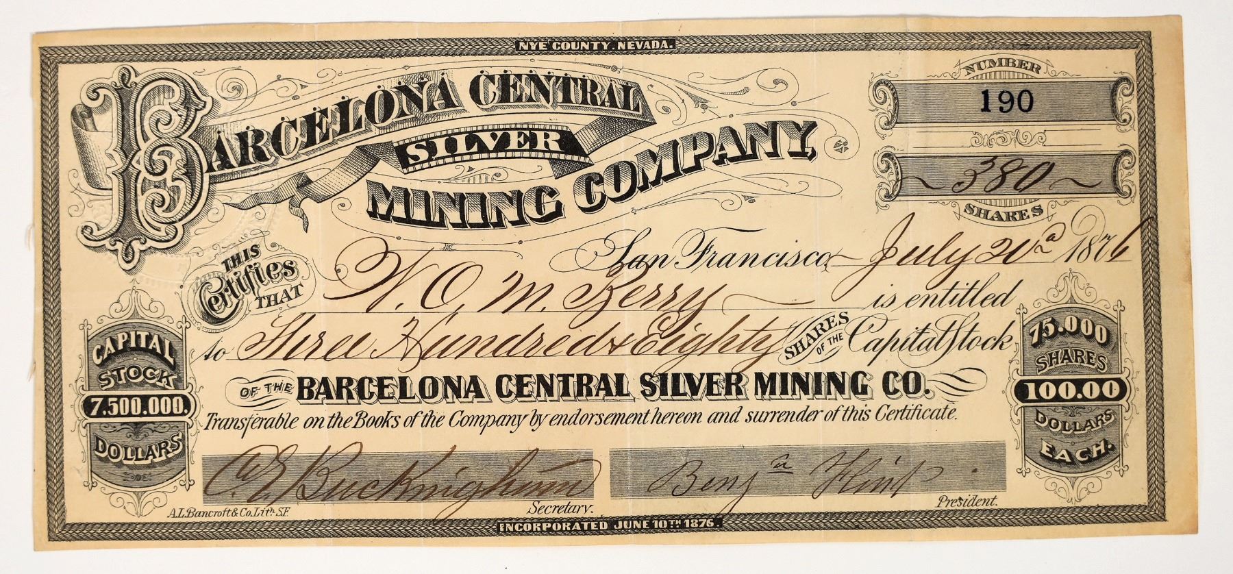 Rare; we haven't sold this before. "Nye County, Nevada" printed at top center. Inc. June 1876. No. 190, issued for 380 shares to WCM Kerry in 1876. Signed by president Benjamin Flint and secretary Buckingham. Not cancelled. Fancy font. AL Bancroft & Co. Lith. Folds, toning. Operated in the Spanish Belt District eight miles northwest of Belmont, Nye County. The Spanish Belt district derives its name from a Castilian grandee named Emanuel San Pedro. He organized and equipped a party of Mexicans in California in 1870 for an expedition into Nevada. After a sojourn on the Comstock Lode, he pushed southeast for 200 miles and established a rendezvous at Spanish Springs, north of Tonopah on the Belmont Road. From this base he divided his company and sent them into the ranges to prospect. The discovery of the Barcelona, South Barcelona, and the Liguria mines in the summer of 1871 was the outcome of his operations, and the beginning of mining at the Spanish Belt. In the meantime, other discoveries followed, and by 1873 a town sprung up just west of San Pedro's castle. Daily stages plied between the camp and Austin. At about this time, a coterie of mining men bought San Pedro's mines. Leasers continued to mine, and by 1890 over a half million dollars of ore had been mined, mainly from the Barcelona mine.