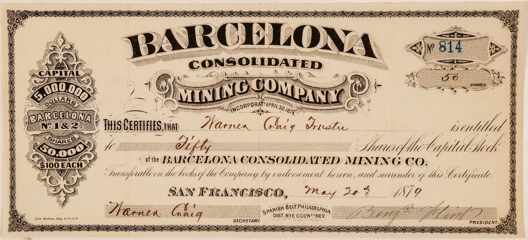 Spanish Belt, Philadelphia District, Nye County, Nev. (printed at bottom center). Inc. April 1874. No. 814, issued for 50 shares to company secretary Warren Craig on May 20th, 1879 in SF. Signed by Craig and president Benjamin Flint. Not cancelled. Black border and print, fancy logo. Printed by Britton, Rey & Co., SF. Folds, clean. 4 x 9" The side of the stock lists the company's two claims: the Barcelona No. 1 and No. 2. Located in the Tecoma Range. Developments included a shaft 175 ft. deep and two levels at the 85 and 175 foot stations. 17 men are employed. They are driving a tunnel to strike the ledge at a depth of 675 ft. below the surface. [Ref: Annual Mining Review and Stock Ledger, 1876, pg. 38] Ken Prag Collection