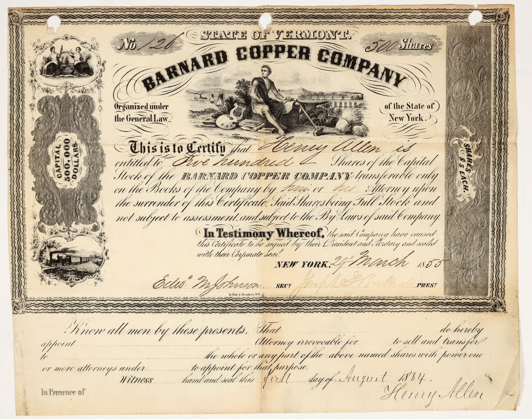 No. 126, issued for 500 shares in 1855 in New York. Signed by the president and secretary. Not cancelled. Allegorical vignettes. Three hole punches at top, folds and creases. 8.25 x 10" Reported in The Vermont Historical Gazetteer - 1871: Nine miles north of the mine in Vershire, is another in the town of Coriulb, owned and worked by the "Corinth Copper Company," which was chartered by the Vermont Legislature in 1855, with a capital of $500,000. Work upon this mine was commenced in 1854, but soon abandoned. In 1853, Henry Barnard of Morristown, NY, purchased the original Richardson farm property including the Tyson mine workings and several adjacent parcels. The Vermont Copper Mining Company was incorporated in 1853 to work the deposit. In 1854, Henry Barnard purchased land north of the Corinth Copper Company, incorporating as the Eureka Mining Company in 1855. Incorporators of the various companies invested in the Ely Mine as well. The mines were not worked seriously until the Civil War, when underground work likely commenced with Cornish miners who had come to Vermont with the Vershire copper boom.
