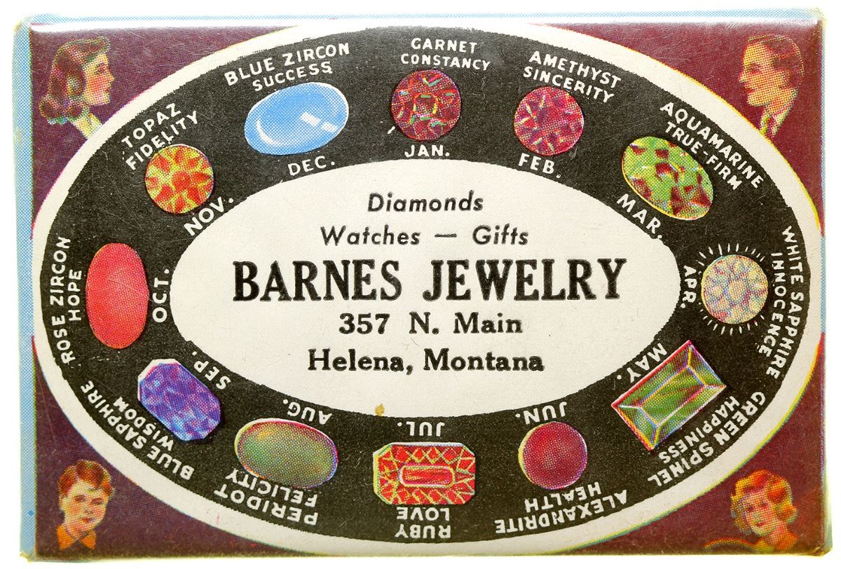 Birthstones from each month are featured on this 3 x 2" advertising mirror. Barnes Jewelry / 357 N. Main / Helena, Montana. City: Helena State: Montana Date: ID: 36840