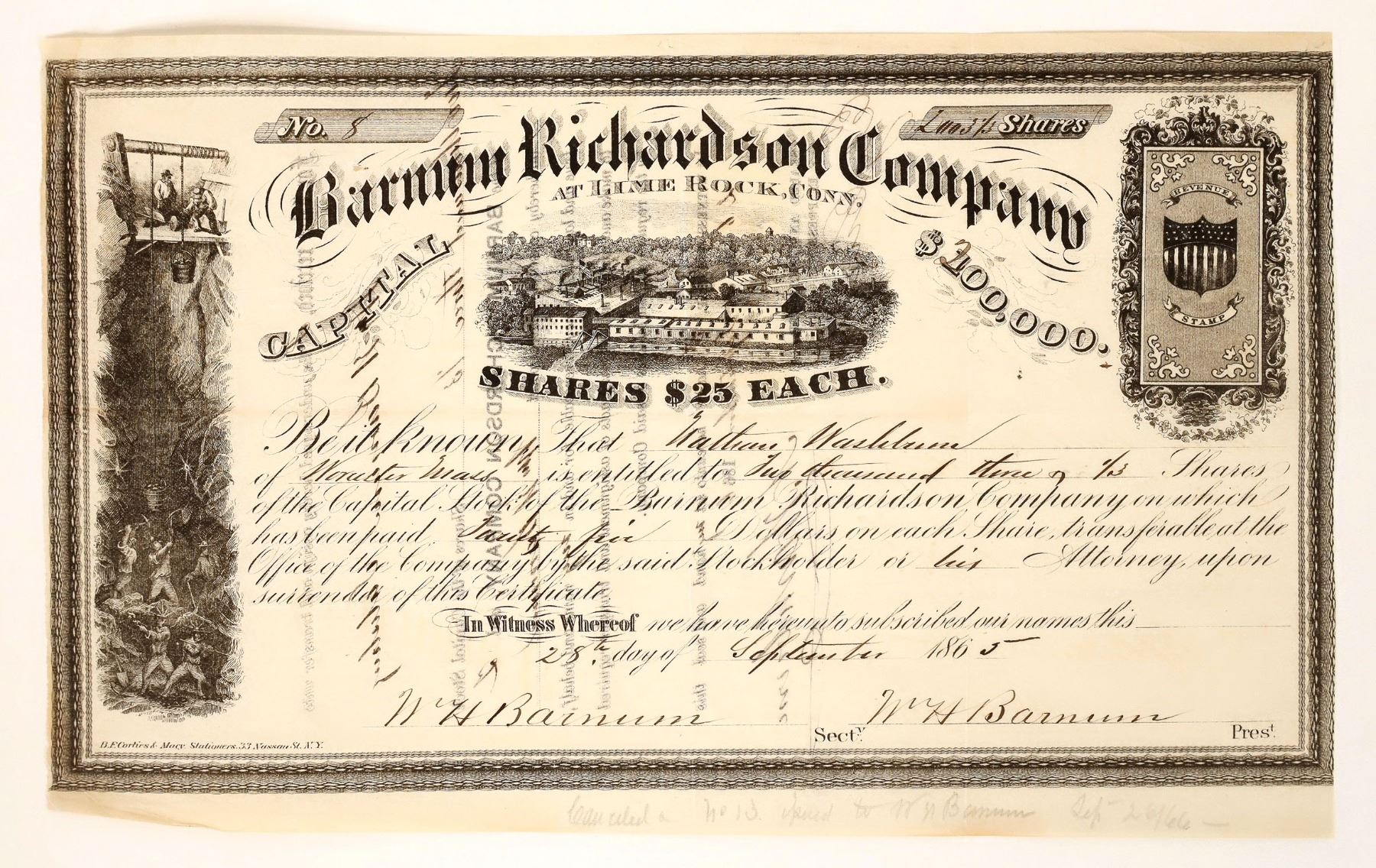 # 8 issue for 2003 1/3 shares. Signed by William H Barnum as president and sec. Dateline 1865. Industrial vignette. Mining vignette on the left side. Printed by BF Corlies & Macy. Not cancelled. Cut close on left. William Henry Barnum was an important industrialist in the 1860's. He started the Barnum Richardson Company with Milo Barnum Richardson, a nephew. It was the leading company in the Salisbury iron district of that time, owning or controlling iron mines, charcoal production resources, limestone quarries, and rail transportation. Barnum Richardson Company was also the preeminent manufacturer of railroad car wheels at a time when the railroad industry held a place in the economy analogous to the computer industry today. [Wikipedia] He partnered with Collis Huntington to form the Ensign Manufacturing Company which manufactured railroad freight cars. He is also known for defeating his third cousin P. T. Barnum for Congress. He would eventually become the longest serving chair of the Democratic National Committee. Great certificate signed by an important industrialist! Small perforation under cert. number.