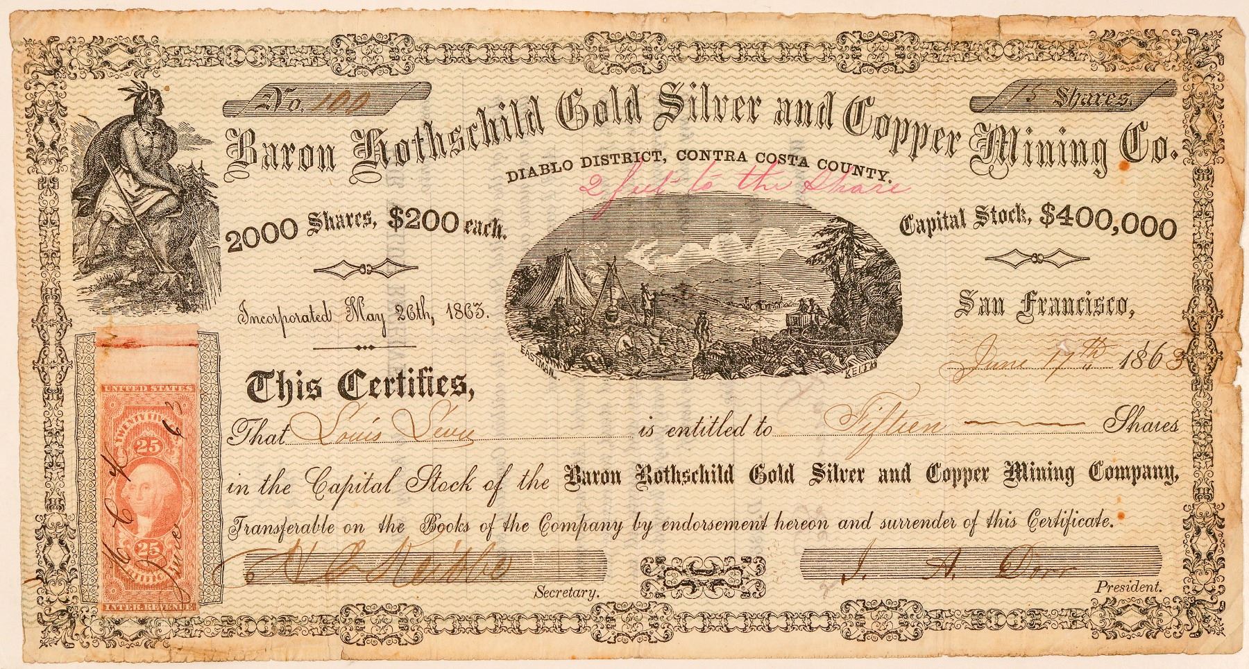 With a William Keith woodblock vignette! Diablo District, Contra Costa County (printed under title). Inc. May 26th, 1863. No. 100, issued for fifteen shares to Louis Levy on June 17th, 1863. Signed by president Dorr and secretary HC Keible. Not cancelled. Black border and print. Two vignettes: Native American (upper left) and classic Western scene of tent camp next to mine entrance by Eastman and Keith. 25 cent adhesive stamp at lower left. Pinhole, folds, creases, some soiling and rough edges. Please inspect. 5.25 x 10" William Keith (1838-1911) was a Scottish-American painter famous for his California landscapes. When Keith came to SF, he formed a partnership with Harrison Eastman in 1862 and with Durbin Van Vleck in 1864. During the 1870s Keith painted a number of six- by ten-foot panoramas of the High Sierra. He also formed a close relationship with John Muir. This mining company was not listed in Filer or Holabird indexes. Not found on CDNC. Ken Prag Collection