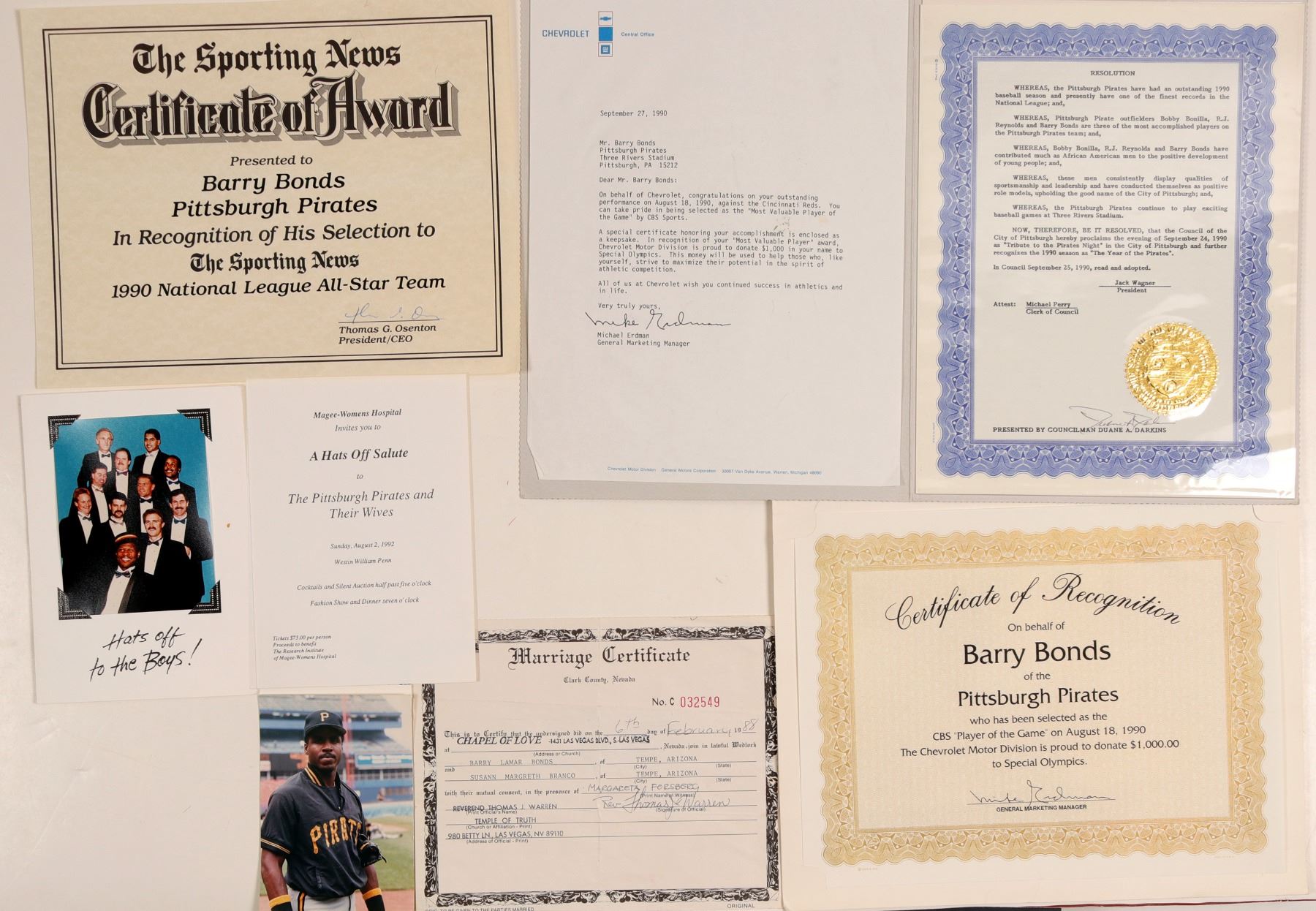 These items were found in the Barry Bonds suitcase. This is a very special lot. 1) We have the original Barry Bonds's marriage certificate to Susann Branco in February 1988. Ceremony was in Vegas. Look at picture for more details. 2) We have a certificate from Chevrolet to Barry Bonds for his performance in 1990 against the Cincinnati Reds. Councilman Duane A. Darkins signed the certificate. Note from Chevrolet and picture of Barry are included. 3) We have an award from The Sporting News presented to Barry Bonds. Signed by Thomas G. Osenton President/CEO. 4) We have an award to Barry Bonds for being a CBS "Player of the Game" on August 18, 1990 from the Chevrolet Motor Division. All originally owned by Barry Bonds. 5) We have an invitation to Magee-Womens Hospital for the Pittsburgh Pirates and their wives. Photo of Barry is on the front. This is a one of a kind lot for any Barry Bonds fan.