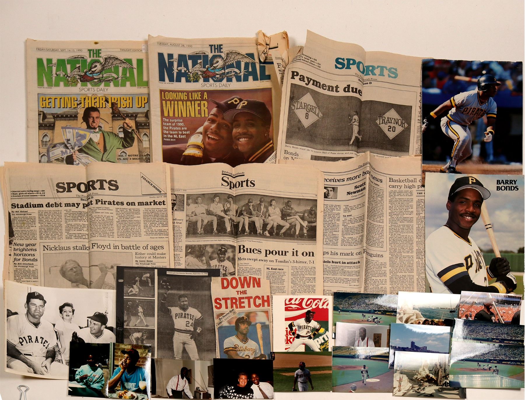 This item was found in the Barry Bonds suitcase. First batch is has 14 personal photos. There are pictures of Barry, taken of Barry, pictures of baseball games, and of someone giving the bird. There is a photo of an unidentifiable man with Barry, who looks to be famous. Two Barry Bonds newspaper clippings. One laminated cutout of Barry Bonds' 50th steal. One Scott Clark photo of Barry Bonds stretching. 6 newspaper clipping with the mention of Barry Bonds. Printout of Barry Bonds history with photo of Pittsburgh Pirates players. All items were previously owned by Barry Bonds.