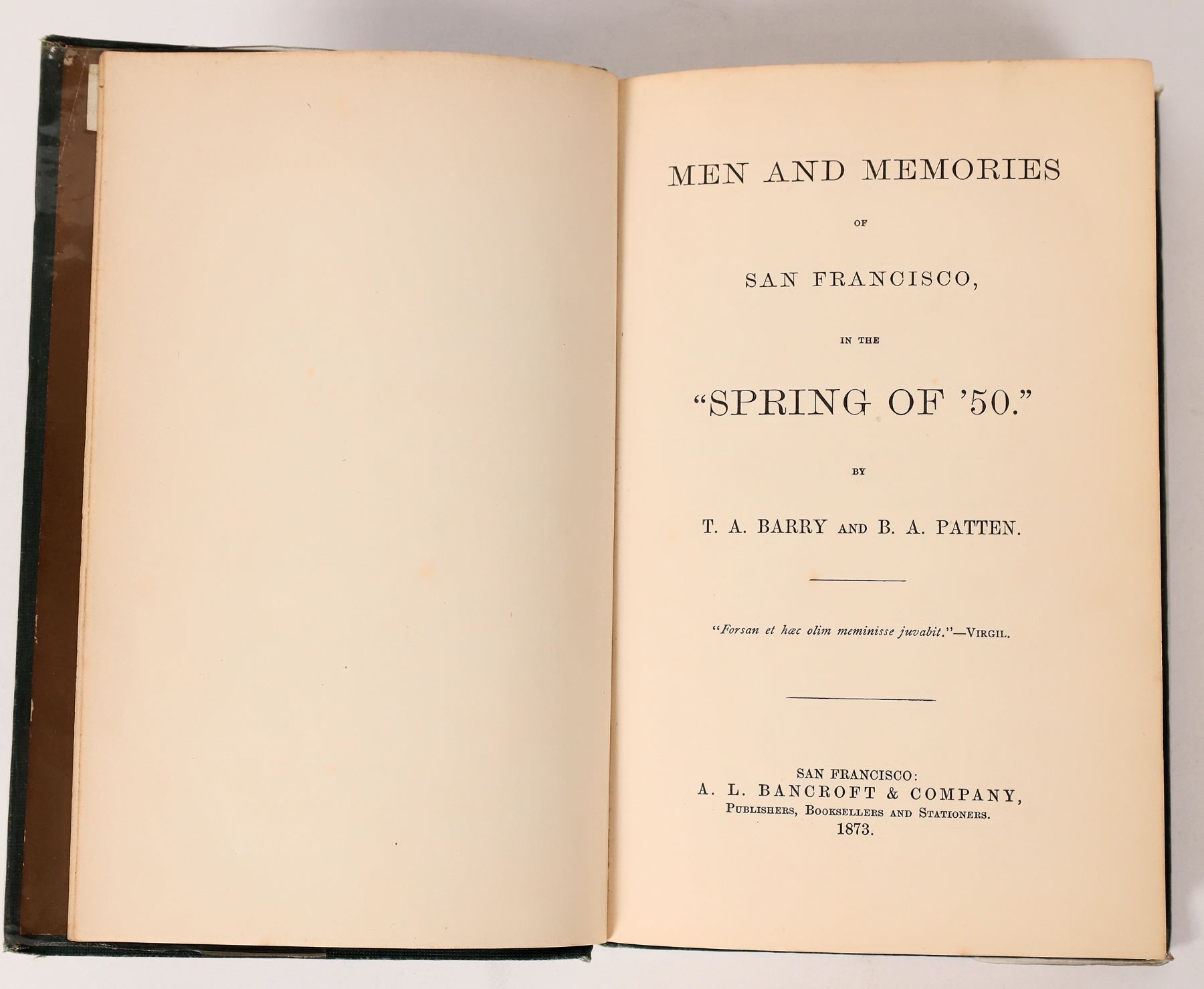 A choice and rare San Francisco first person's history of San Francisco in 1850-1851. "San Francisco in the Spring of '50", aka Men and memories of San Francisco in the Spring of 1850" by TA Barry and BA Patten published by Bancroft, SF, 1873. 296pp, 5.5 x 8", green cloth cover. Barry & Patten arrived in san Francisco aboard the steamer Columbus on June 6, 1850 and promptly set about obtaining a site for a saloon. At the time, the most popular saloon, according to them, was the "Tehama" on the southeast corner of Montgomery & Pine. They chose a location very nearby such that when something happened at the Tehama, business drifted over to their place. The pair put out a rare storecard token in 1868, also available in this sale from the Coelln Collection, and an embossed whiskey bottle, extremely rare, which our collector was never able to obtain. This book is a remarkable first person record of every business and person, written street by street, building to building. The book does not mention the storecard or the bottle. San Francisco California