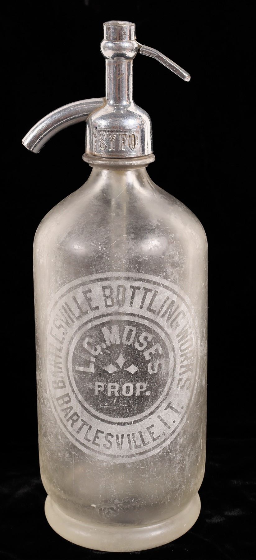 Clear Bartlesville Bottling, Indian Territory seltzer bottle. Some case wear. No apparent chips or cracks. Bartlesville Indian Territory