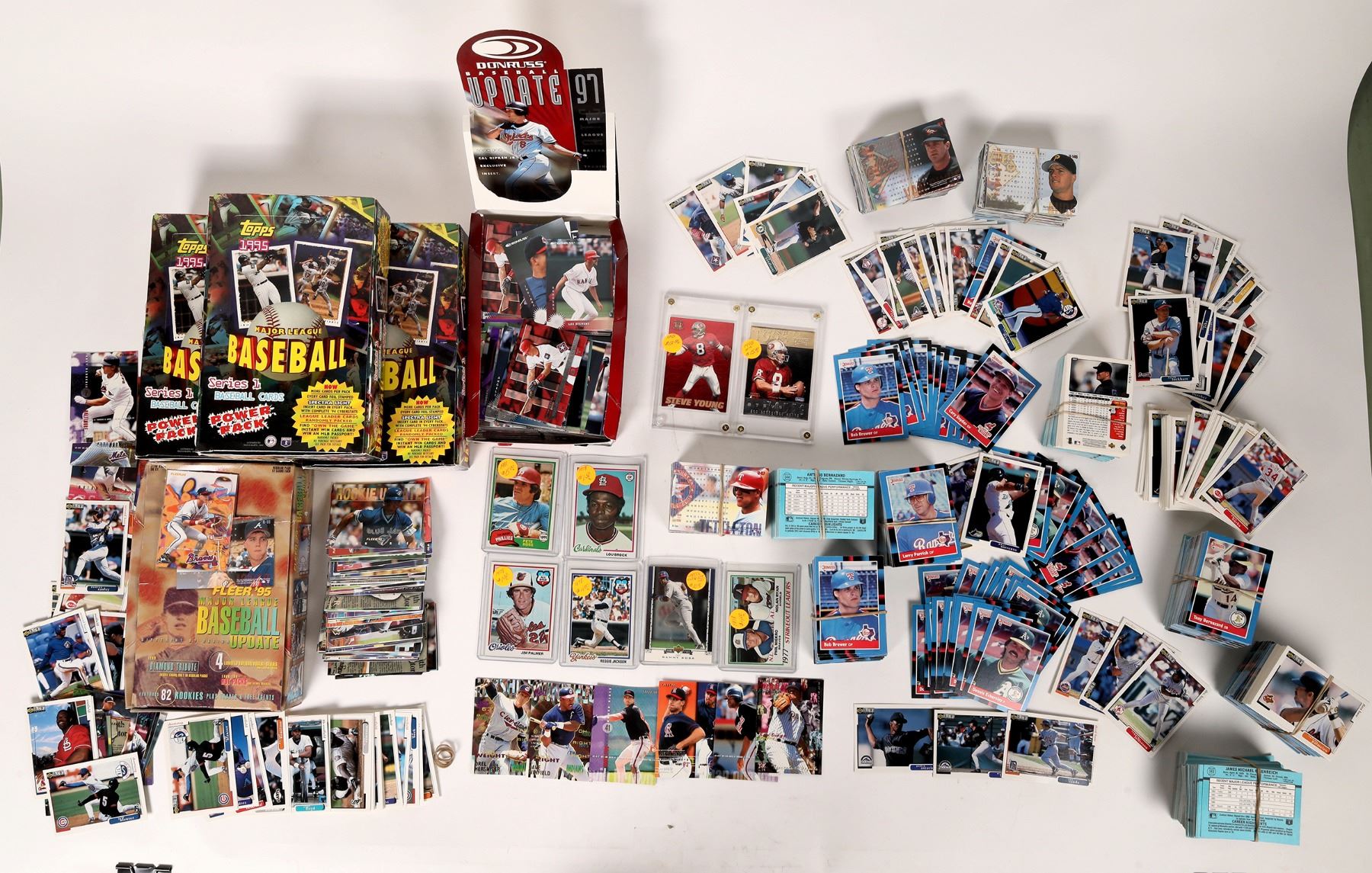 Baseball card junkies, this lot's for you. Thousands of Topps & Donruss cards from the 1990s, mostly in mint condition. Players like Hall of Famers Dennis Eckersley, Ken Griffey Jr. and Lou Brock, among others. The packs in the Topps boxes have been open, but with changing prices, there could be a missed gem among the multitudes. 1995