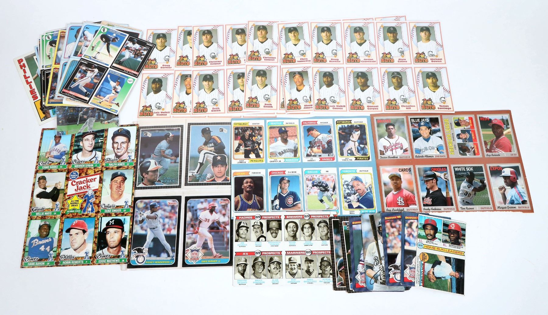 Baseball cards from Fleer, Donruss, Topps and Cracker Jacks (100+). Some are in uncut sheets, some are oversize. Players include Willie Mays, Rickey Henderson, Nolan Ryan, Cal Ripken Jr. and many more. All in nice condition. Please see photos for more details.