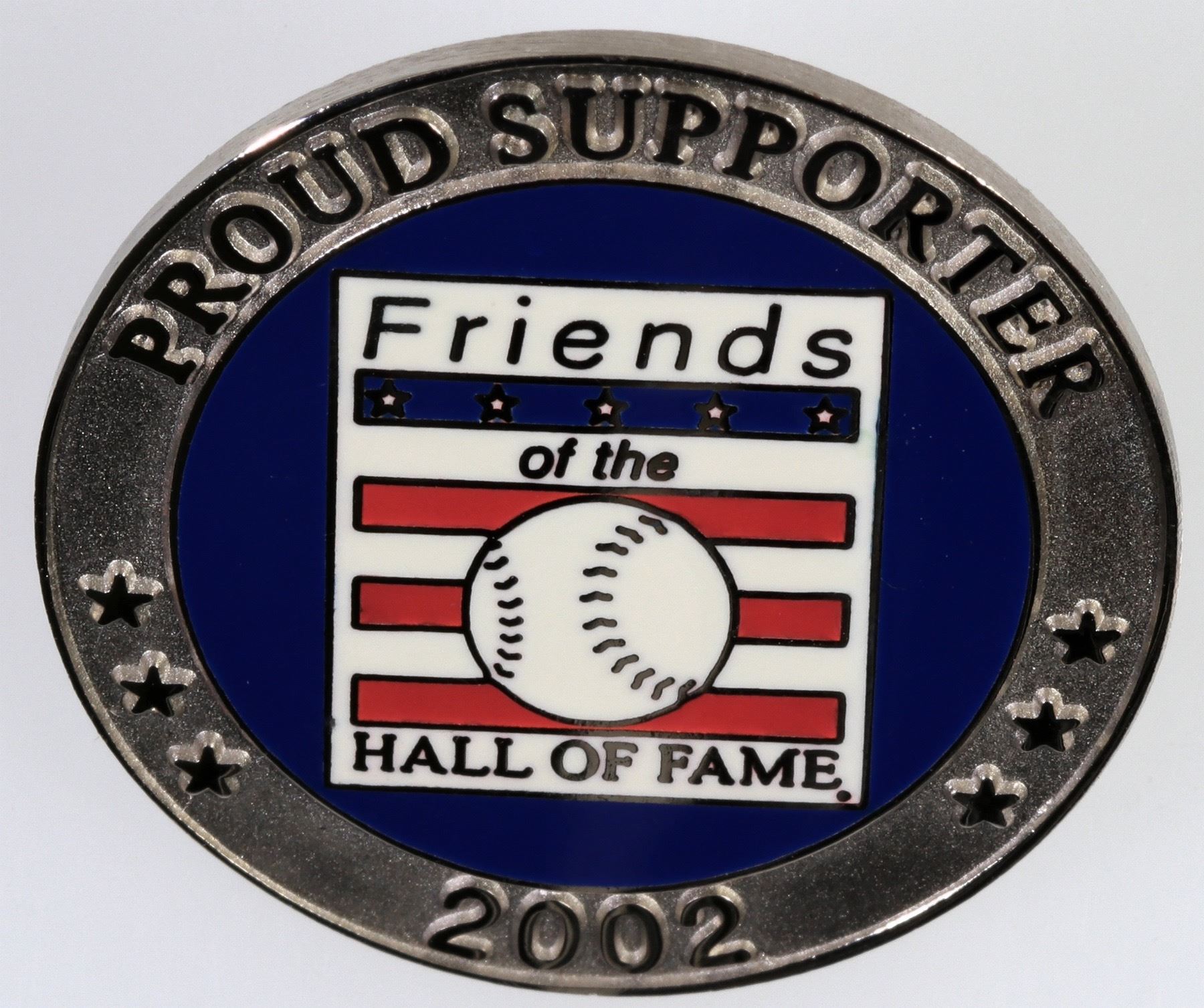 This Baseball Hall of Fame lapel pin is marked "Proud Supporter Friends of the Baseball Hall of Fame 2002". Not everyone got one of these pins, not available at the HOF store. You had to give a donation to get this pin. Silver tone, new in the plastic envelope. 1 1/4 in. diameter.