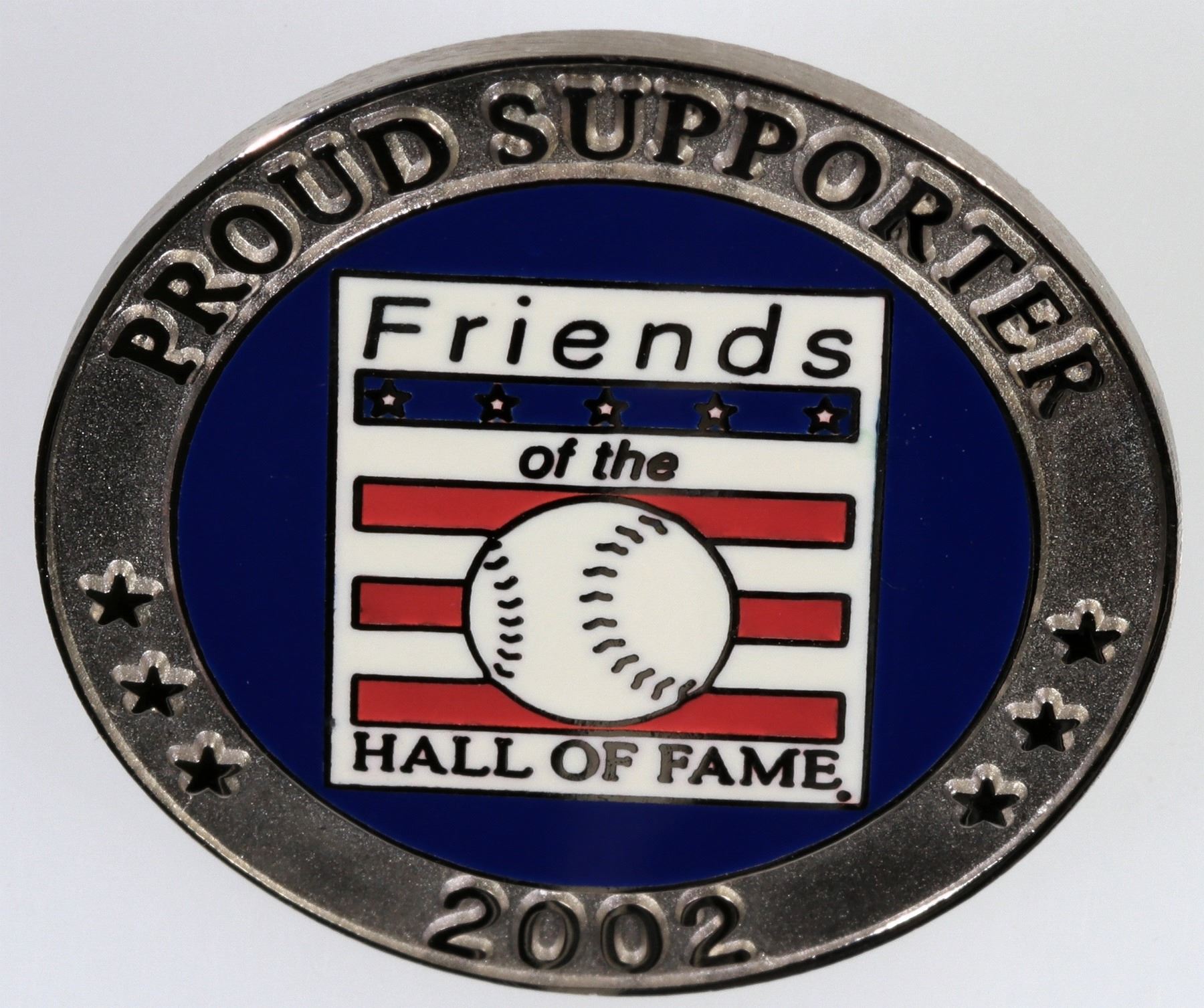 This Baseball Hall of Fame lapel pin is marked "Proud Supporter Friends of the Baseball Hall of Fame 2002". Not everyone got one of these pins, not available at the HOF store. You had to give a donation to get this pin. Silver tone, new in the plastic envelope. 1 1/4 in. diameter. 2002