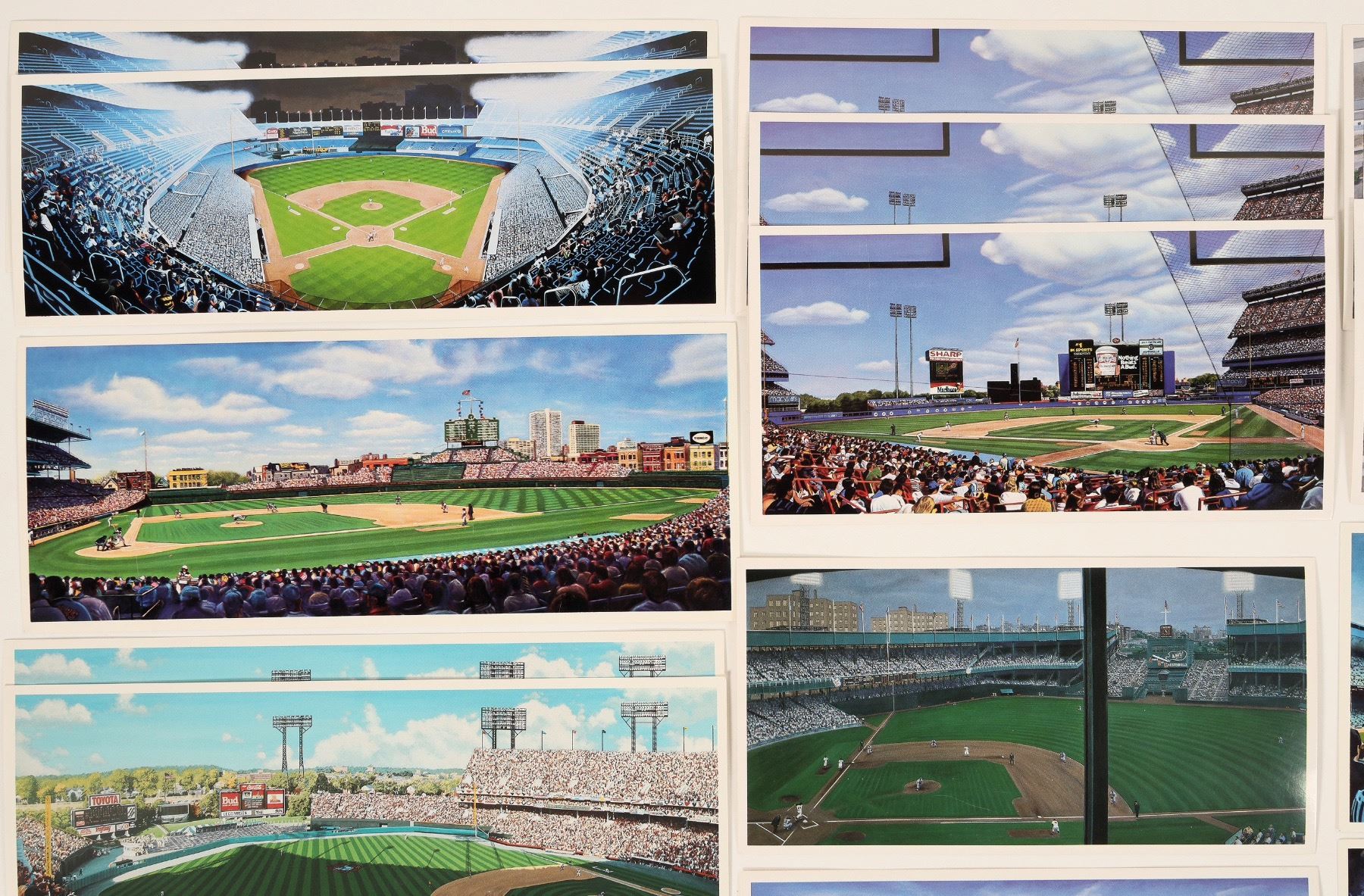 Small group of colorful illustrations of major league ballparks past and present. Cards range in size from 4"x 9" down to 4"x 5". Ballparks include Connie Mack , Ebbetts Field, Yankee Stadium, Fenway and more. All in excellent condition. Please see photos for more details.[