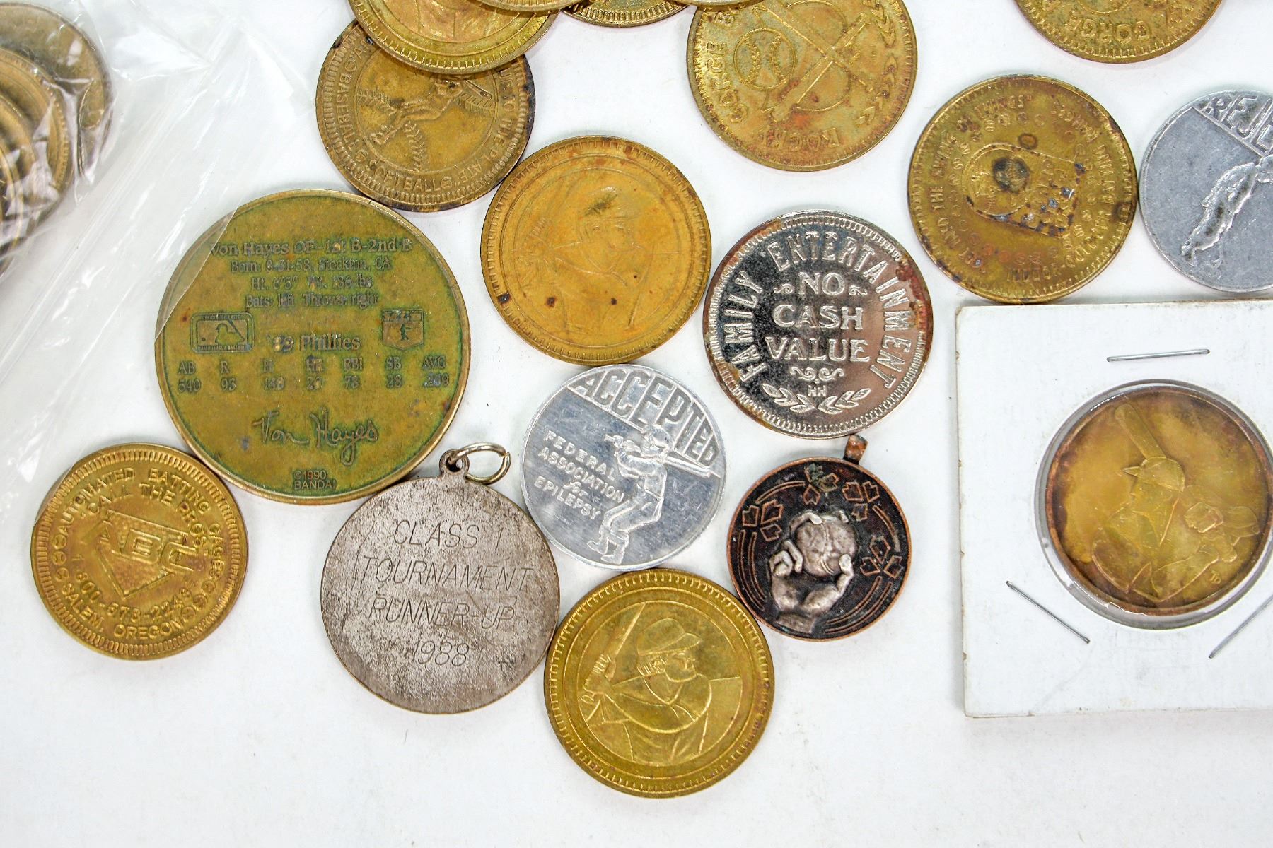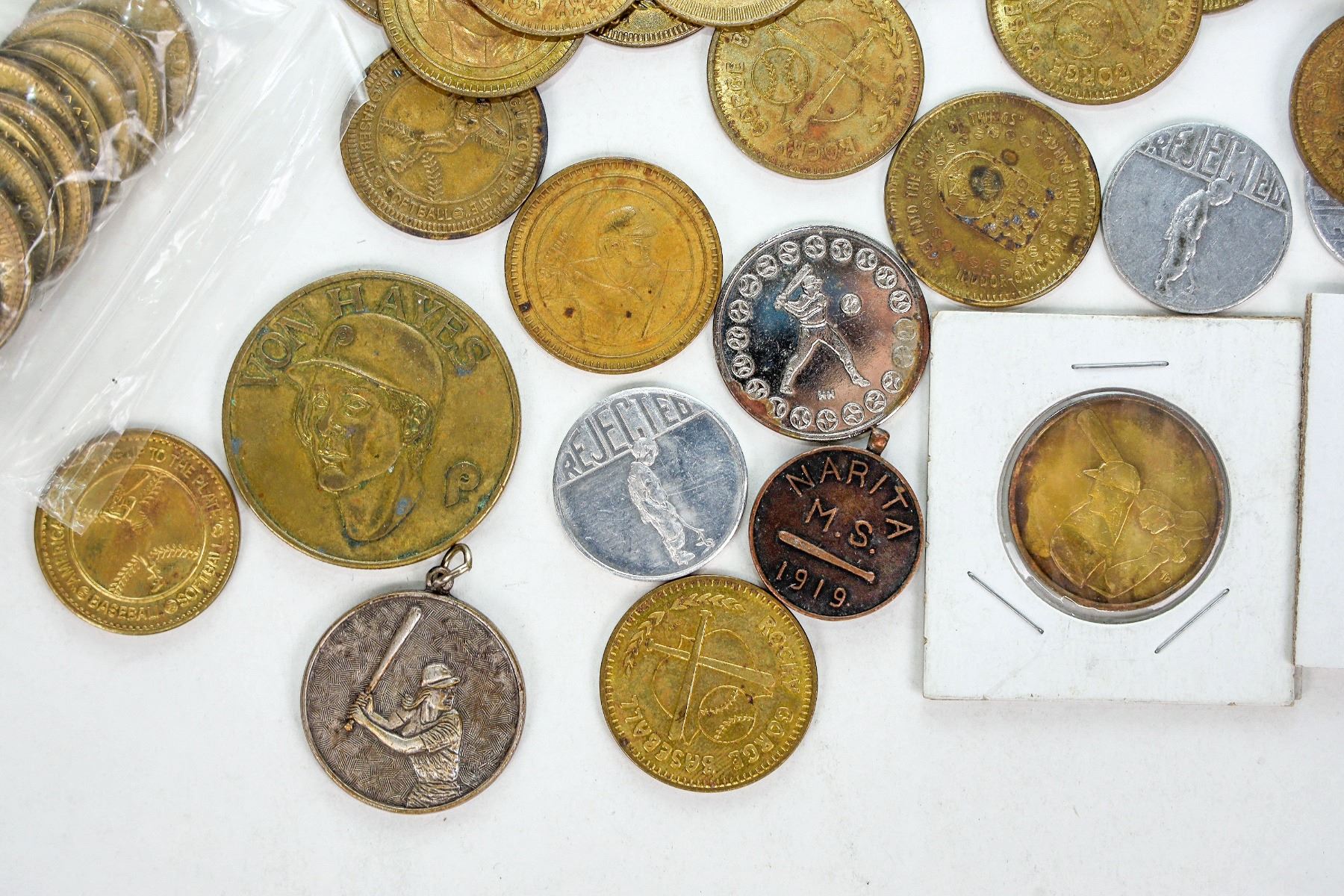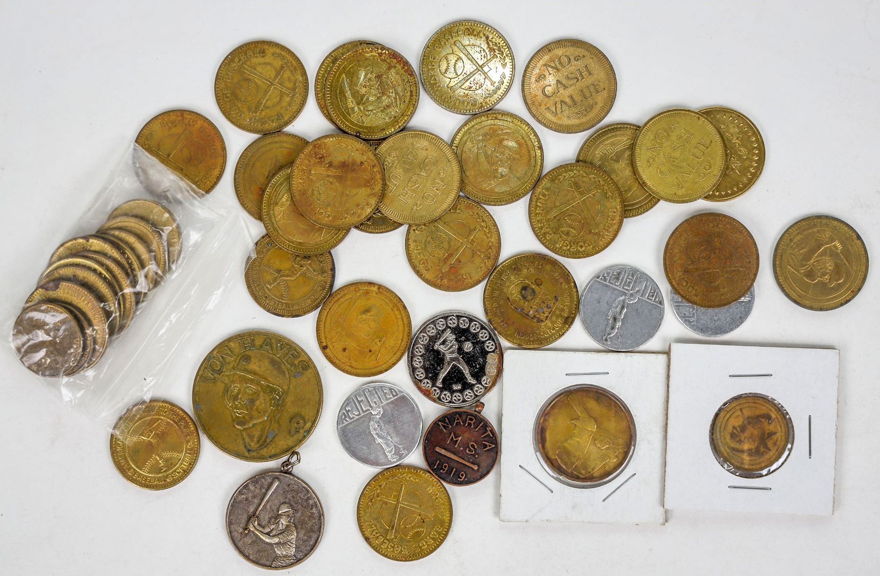 Baseball tokens, including but not limited to Rocky Gorge Baseball tokens, Bandai Von Hayes token, and accepted/rejected coinflip token from the Federal association for Epilepsy. Most coins are in good condition with a few coins having mildly uneven coloration. Other varieties of tokens not specified here; see photos.