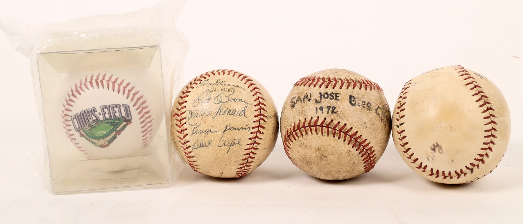 Baseballs (4). One souvenir ball from Coors Field (Unsigned &Unused), one Official Little League ball, with faint writing on it, one appears to be a game used ball, bearing the handwritten lettering "San Jose Bees 1972" and the fourth, a San Jose Bees signed ball from 1973. The Bees were the California League minor league team for the Kansas City Royals back in those days and boasted players like Frank White and future Hall of Famer, George Brett.