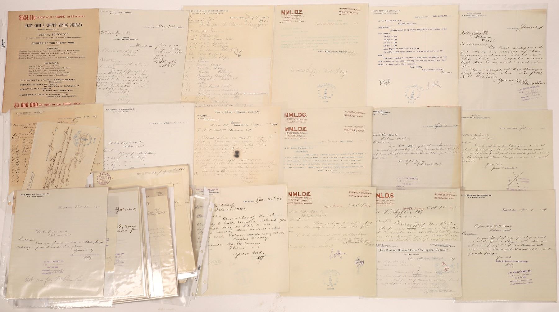 This lot of approximately 100 documents deals mostly with letterheads from mining operations around Basin, Montana. There are also several handwritten letters that accompany this group. Please see photos for more detail and condition.