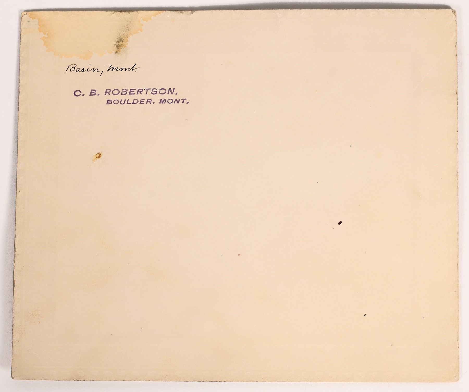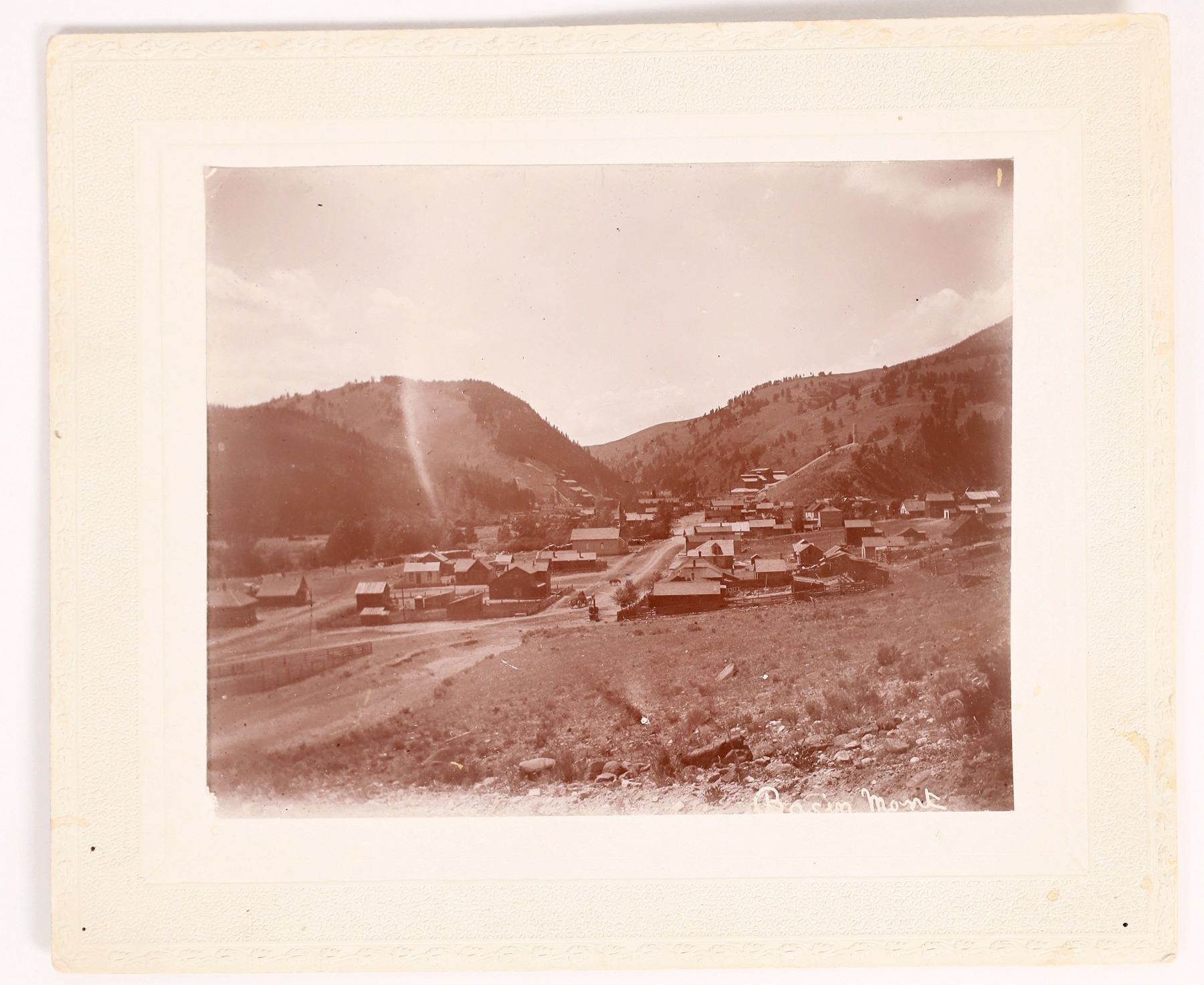 3.5 x 4.5 in photo of Basin, Mt from above showing the town. Photo by C B Robertson, Boulder, Mont. Small upper left dogear & small lower left chip. [Basin Montana