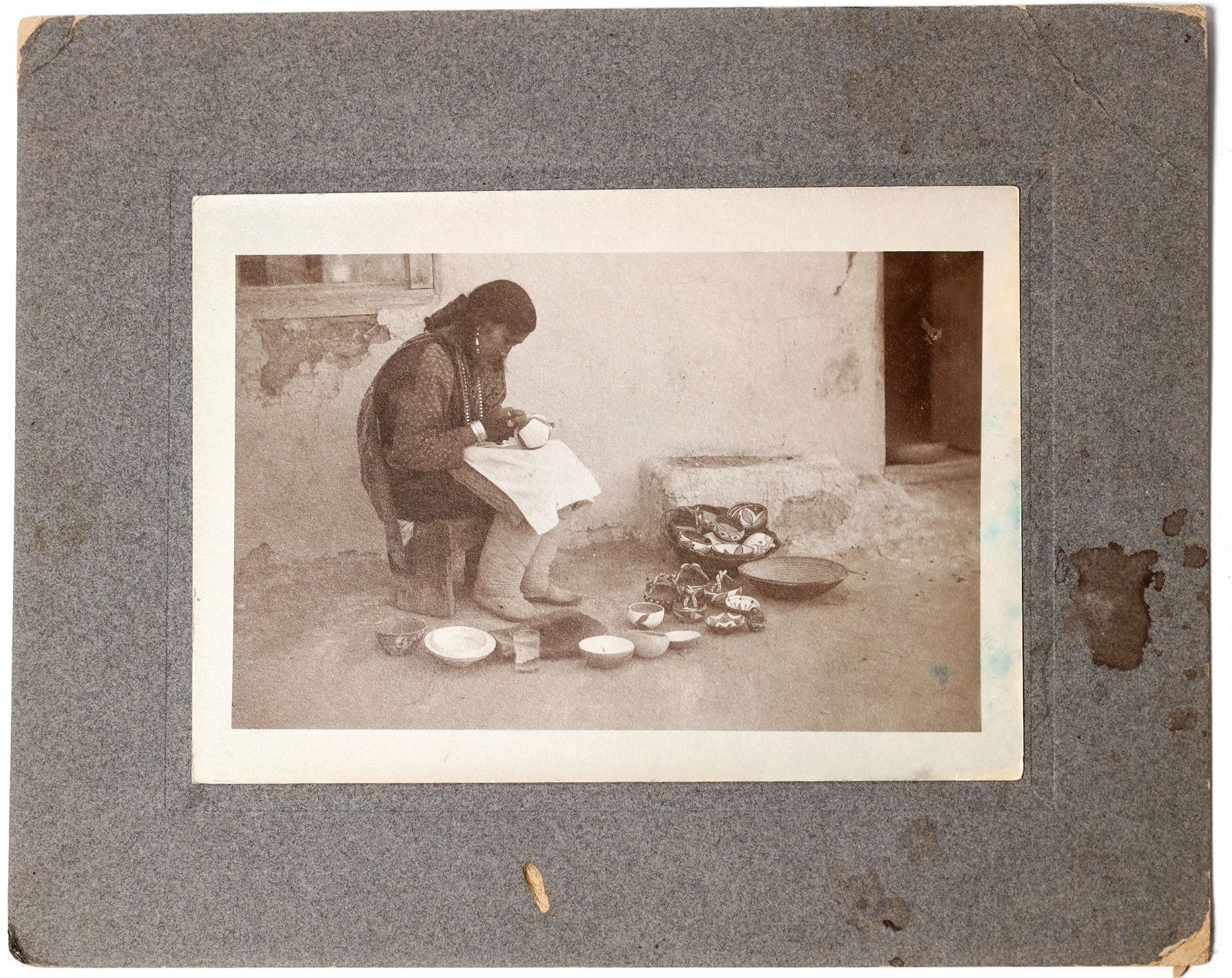 Mounted photo of a basket beader at work. c. 1920's. Photo 5x7". Light turquoise staining mostly on right border and mat.