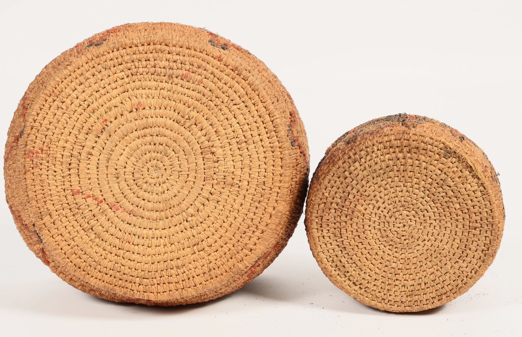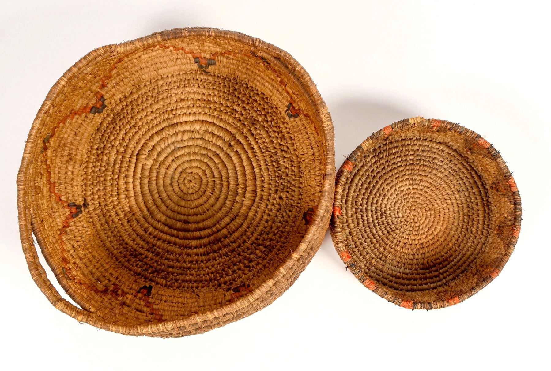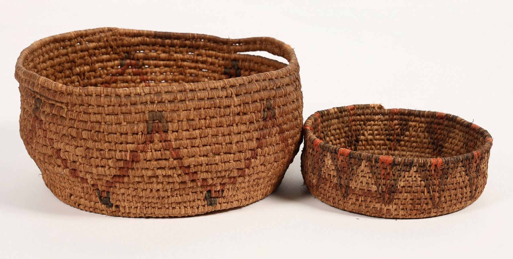 Woven baskets, likely made in Africa. Well constructed round baskets, sturdy and flexible, with colored patterning. Large basket has 2 handles, 3" across. Large basket's overall diameter measures about 8", height measures 4". Small basket measures 5.5" across and just under 2" tall. Good condition. See photo.