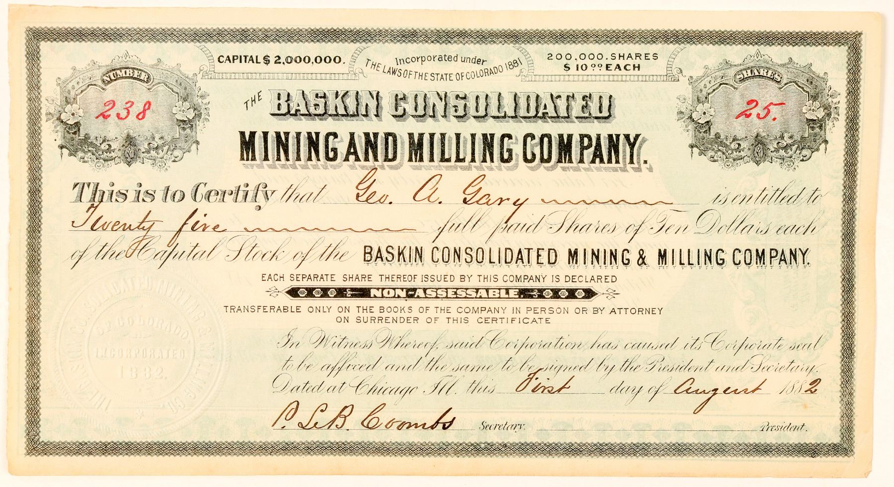 Exact location not known. Not listed in Burchard or C&L. Incorporated in Colorado. Office also in Chicago. No. 238, issued for 25 shares to Geo. A. Gary on August 1, 1882. Signed by the secretary only (P.L.B. Coombs). Not cancelled. No vignette. Black border. 5" x 8.5" Folds. Ready for research by a Colorado collector or historian! () State: Colorado City: Date: 1882