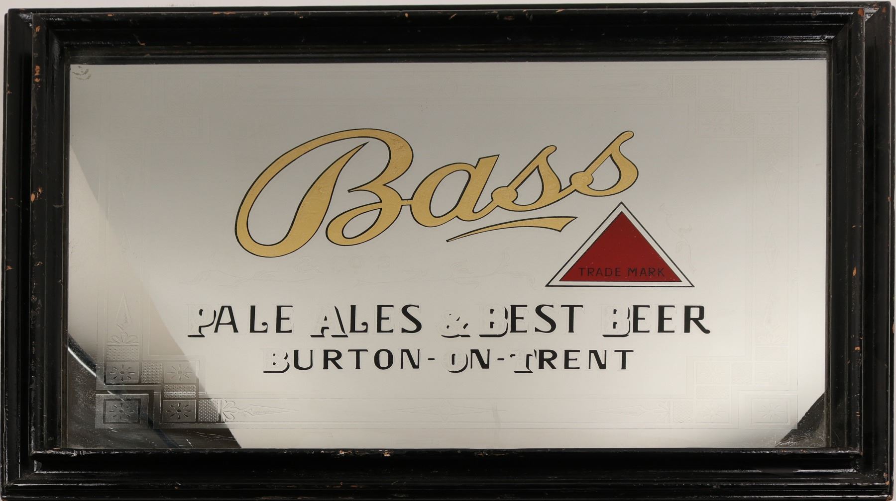 Vintage Saloon Mirror advertising Bass Ale. With frame is 35" x 29". Mirror is in good condition. The frame has some scuffing on the wood. The back of the frame has been reinforced with wood that has been screwed to the frame. Please inspect.