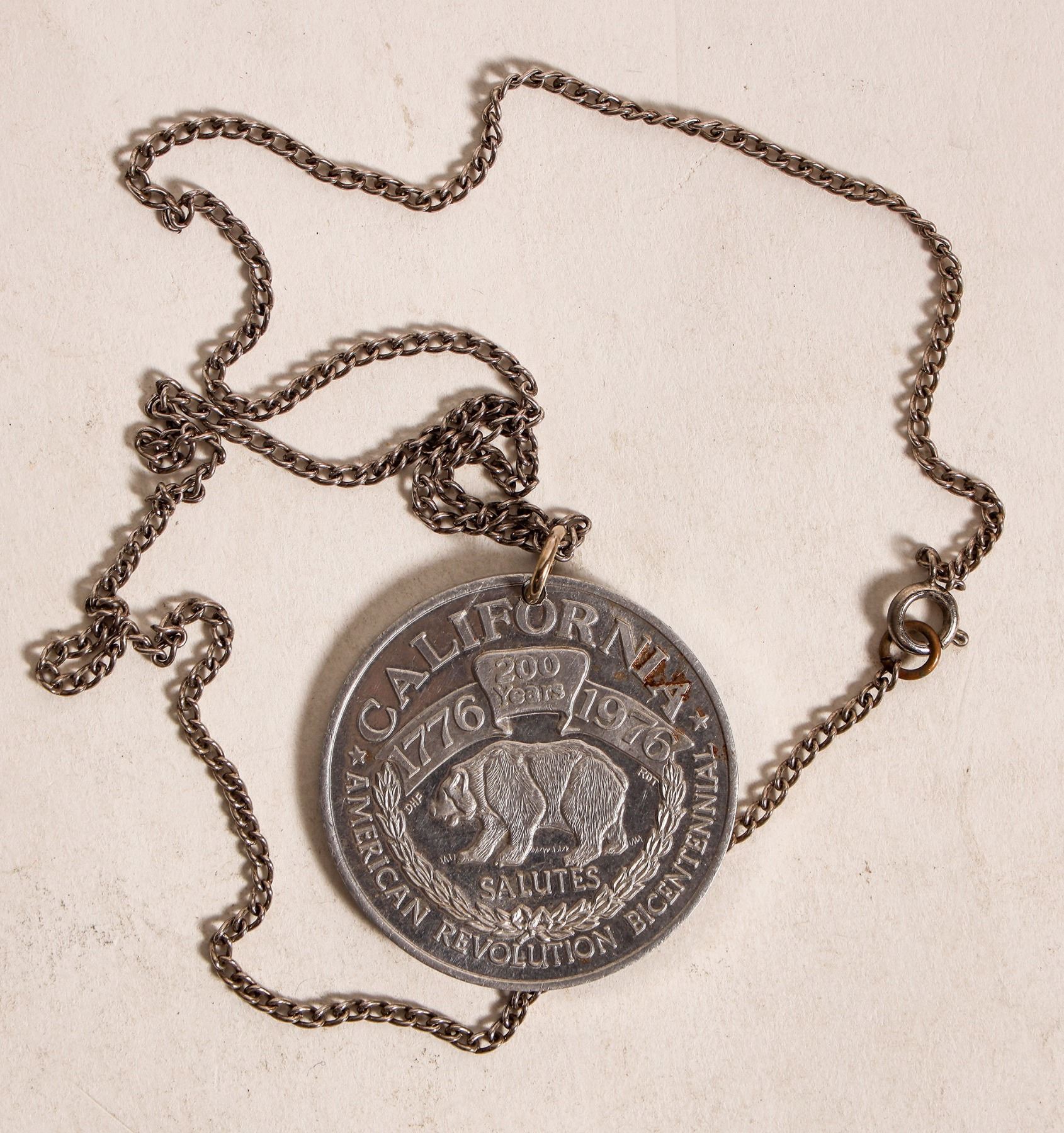 Madera County celebrated the American Bicentennial with fireworks: BASS LAKE BOAT CLUB / JULY / 4TH / FIREWORKS / DISPLAY / BASS LAKE, CAL. // CALIFORNIA / 200 / YEARS / 1776 1976 / DHF RUT / SALUTES / AMERICAN REVOLUTION BICENTENNIAL; Al., rd., 39 mm, holed with necklace chain._x000D_ [Bass Lake] [California]