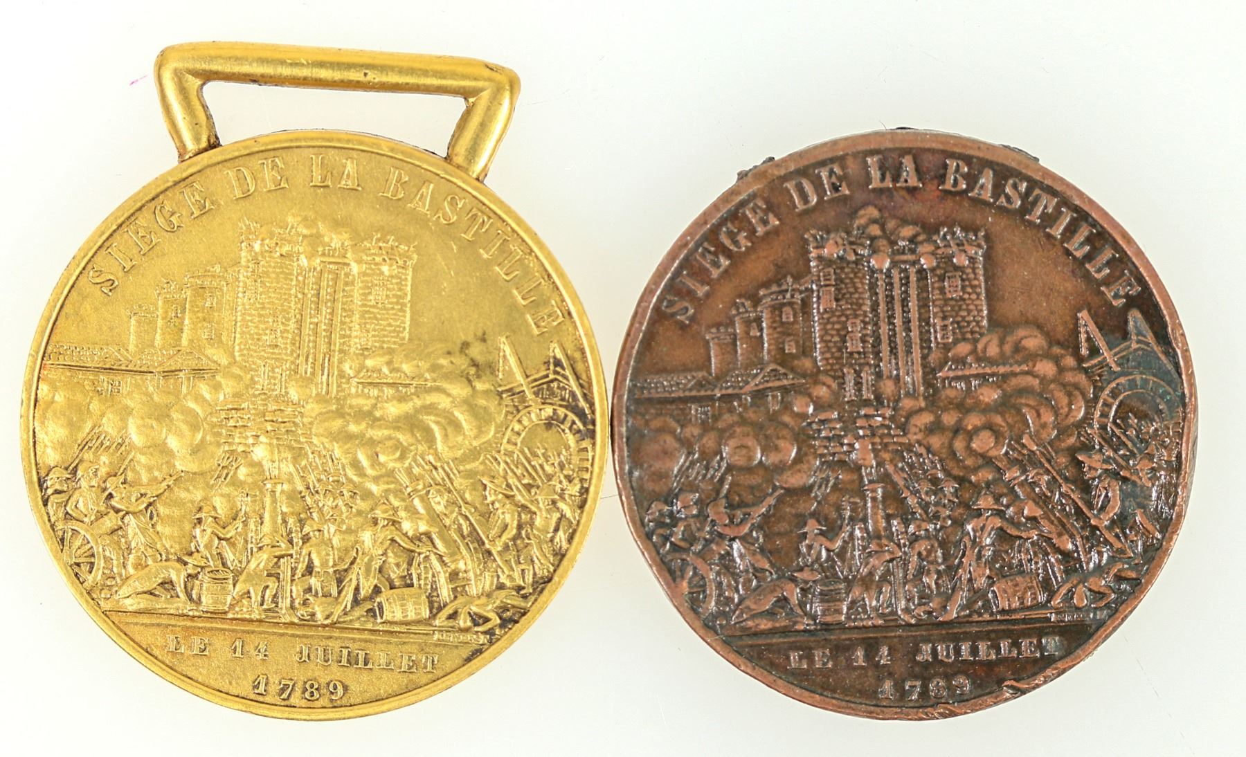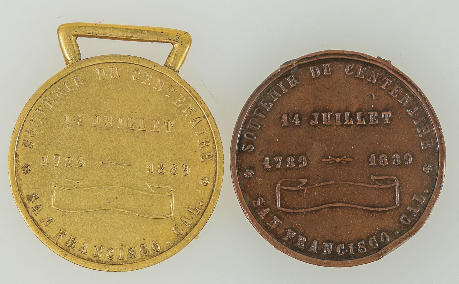 Two medals commemorating the centennial of Bastille Day July 14, 1889, both from San Francisco. One bronze, one gilt (with bar for hanging), both 31 mm.