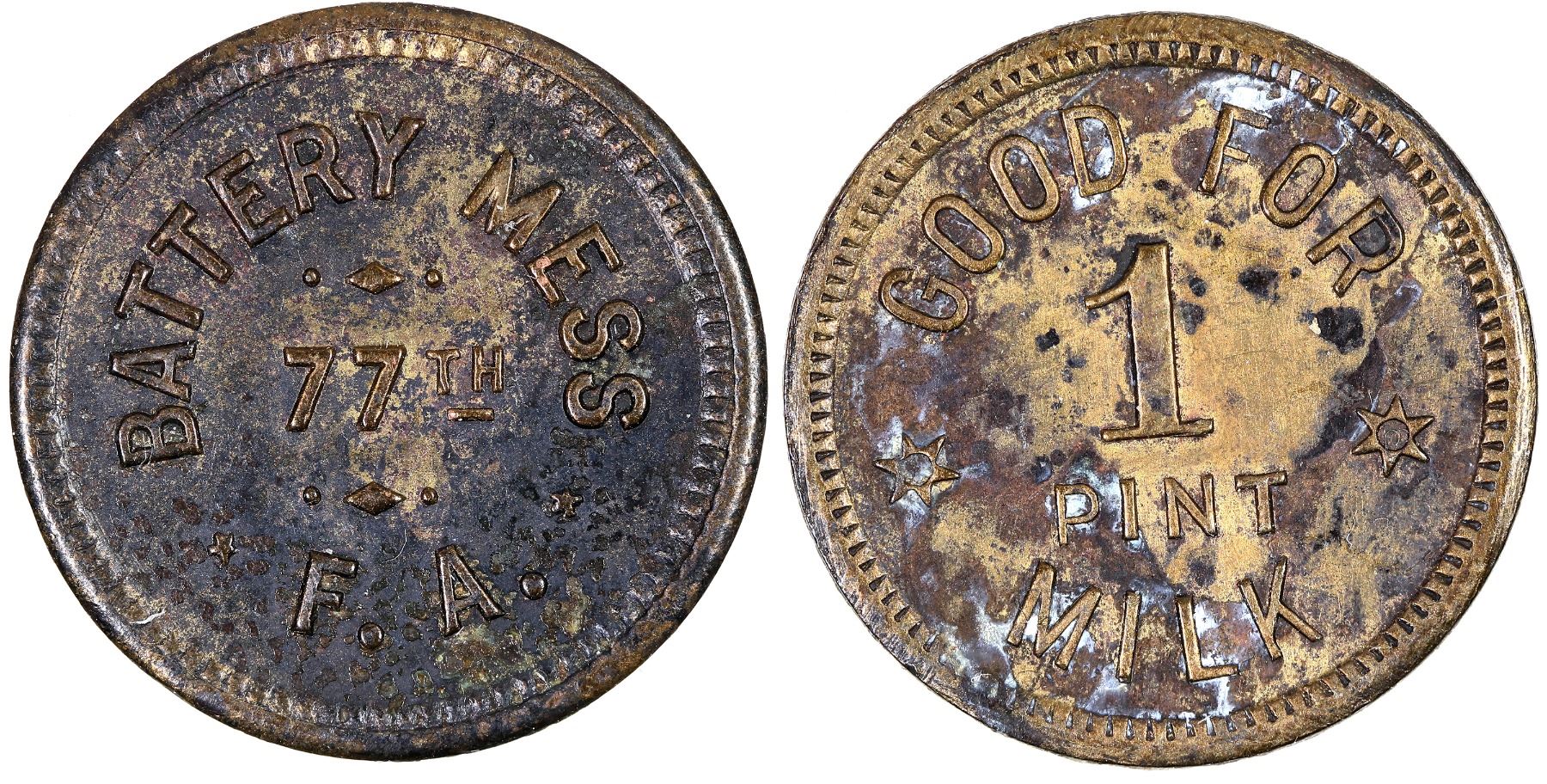 Also attributed to Camp Dodge, Iowa, unlisted in Chadwick. BATTERY MESS / 77TH / F.A. // GOOD FOR / 1 / PINT / MILK; Br. rd., 21 mm. The 1st Battalion, 77th Field Artillery, "Falcons," was first constituted 1 July 1916, and was assigned to the 4th Division. The Battalion distinguished itself during four campaigns in World War I. The battalion was activated on 1 January, 1935 at Fort Sill, Oklahoma and assigned once again to the 4th Division and then relieved from assignment on 16 October, 1939.