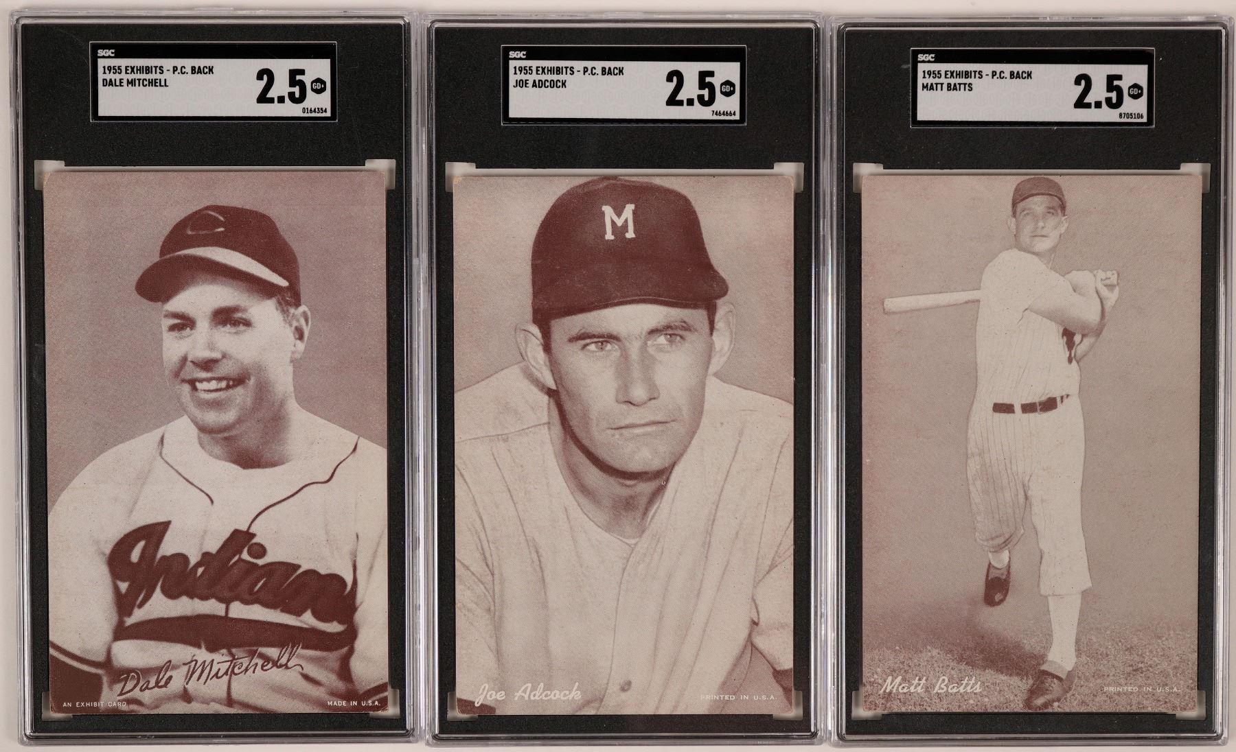 These are three MLB player Mutoscope postcards, featuring players Joe Adcock, Matt Batts and Dale Mitchell. These cards in in good condition. See photos for more detail.